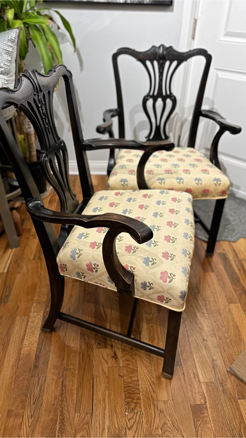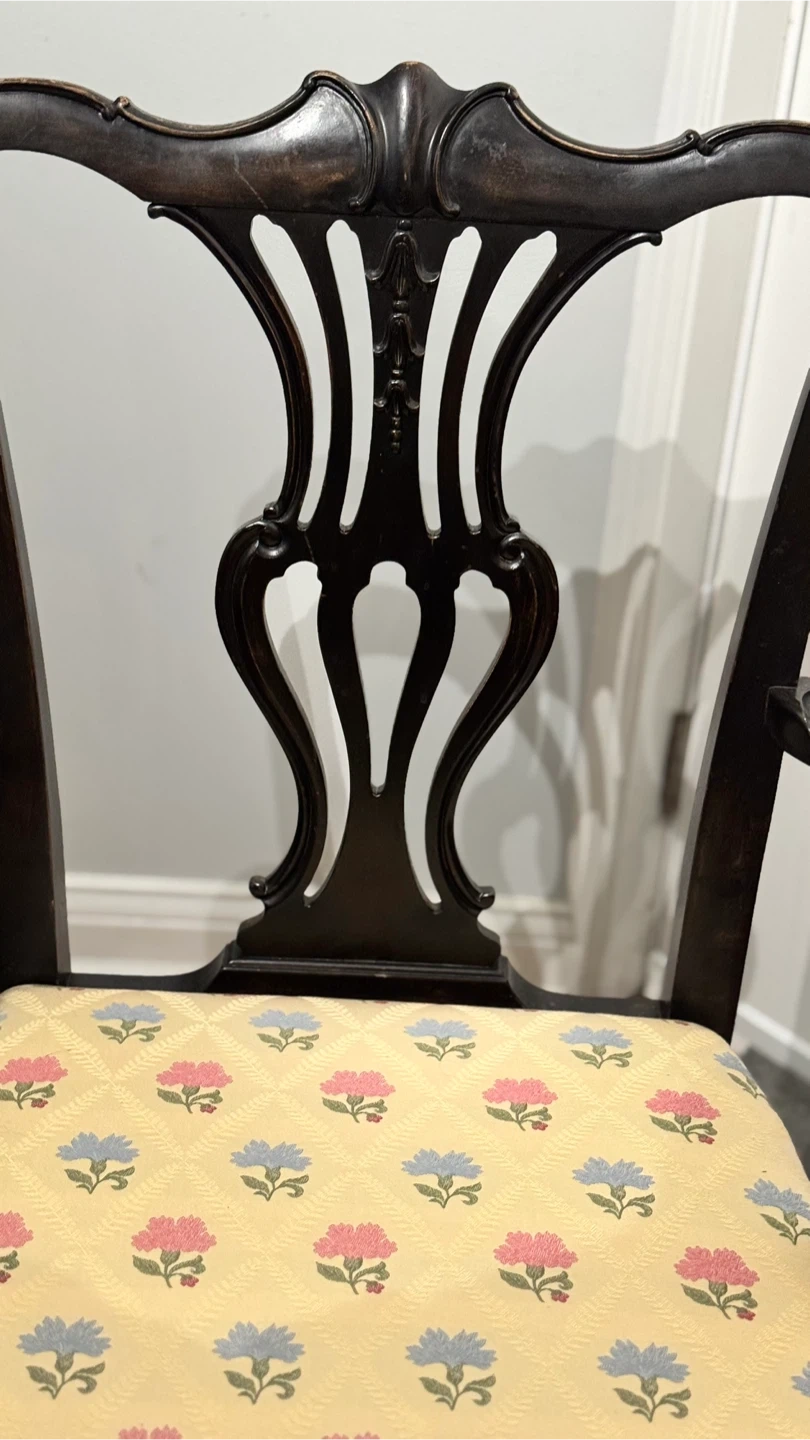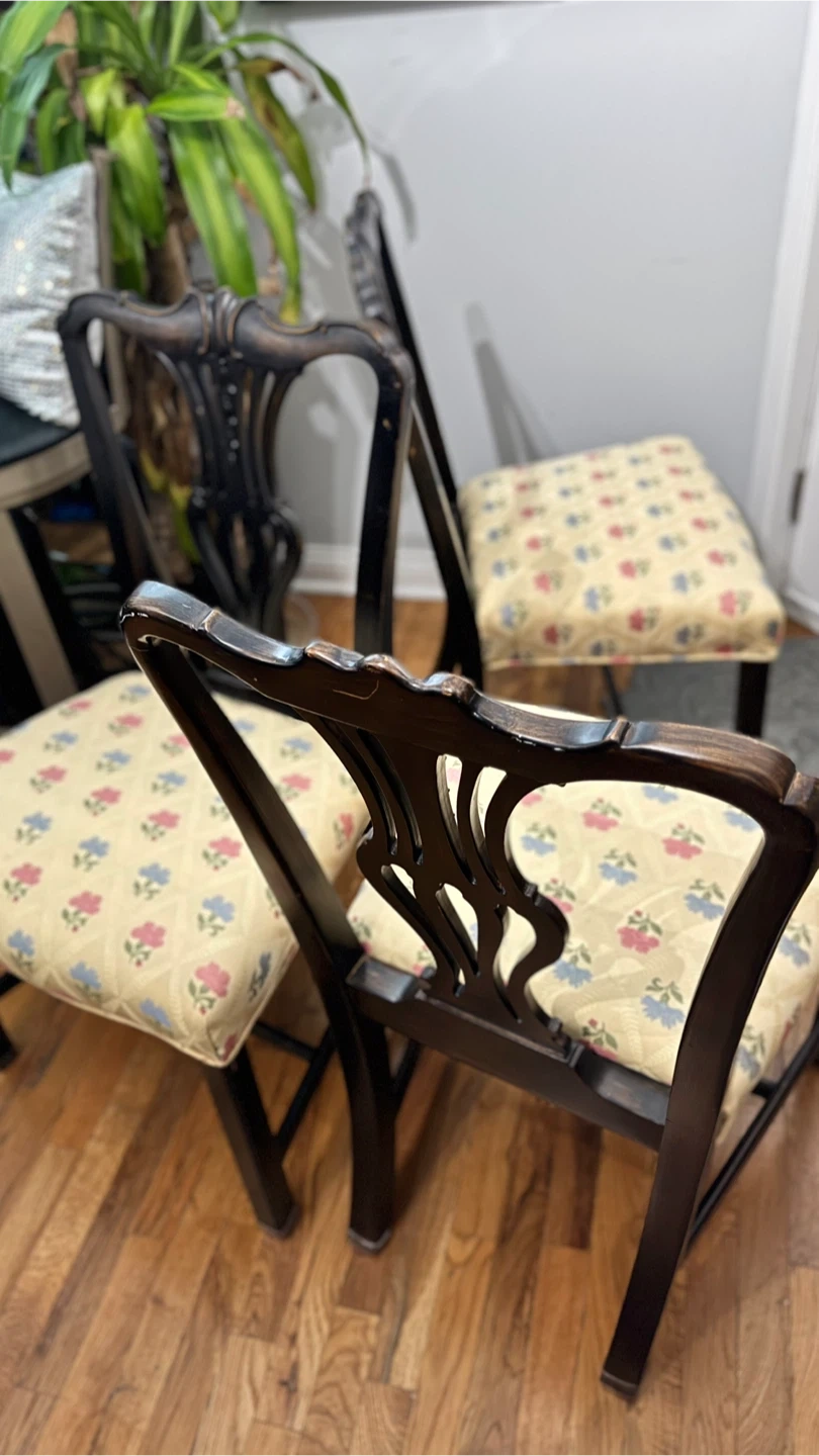 Selling a set of four antique dining chairs. They have a beautiful dark wood finish and a reupholstered floral patterned seat. These chairs would add a touch of elegance to any dining room!