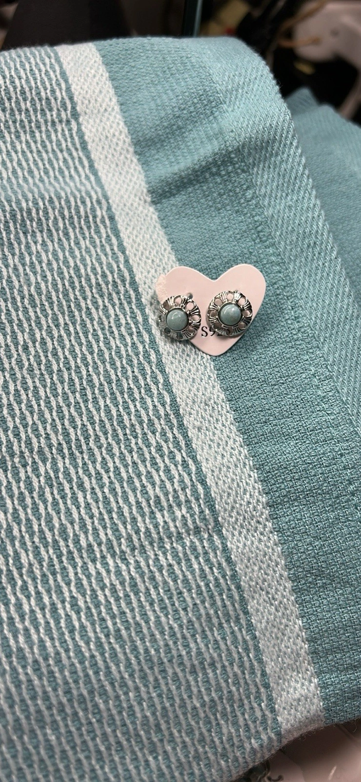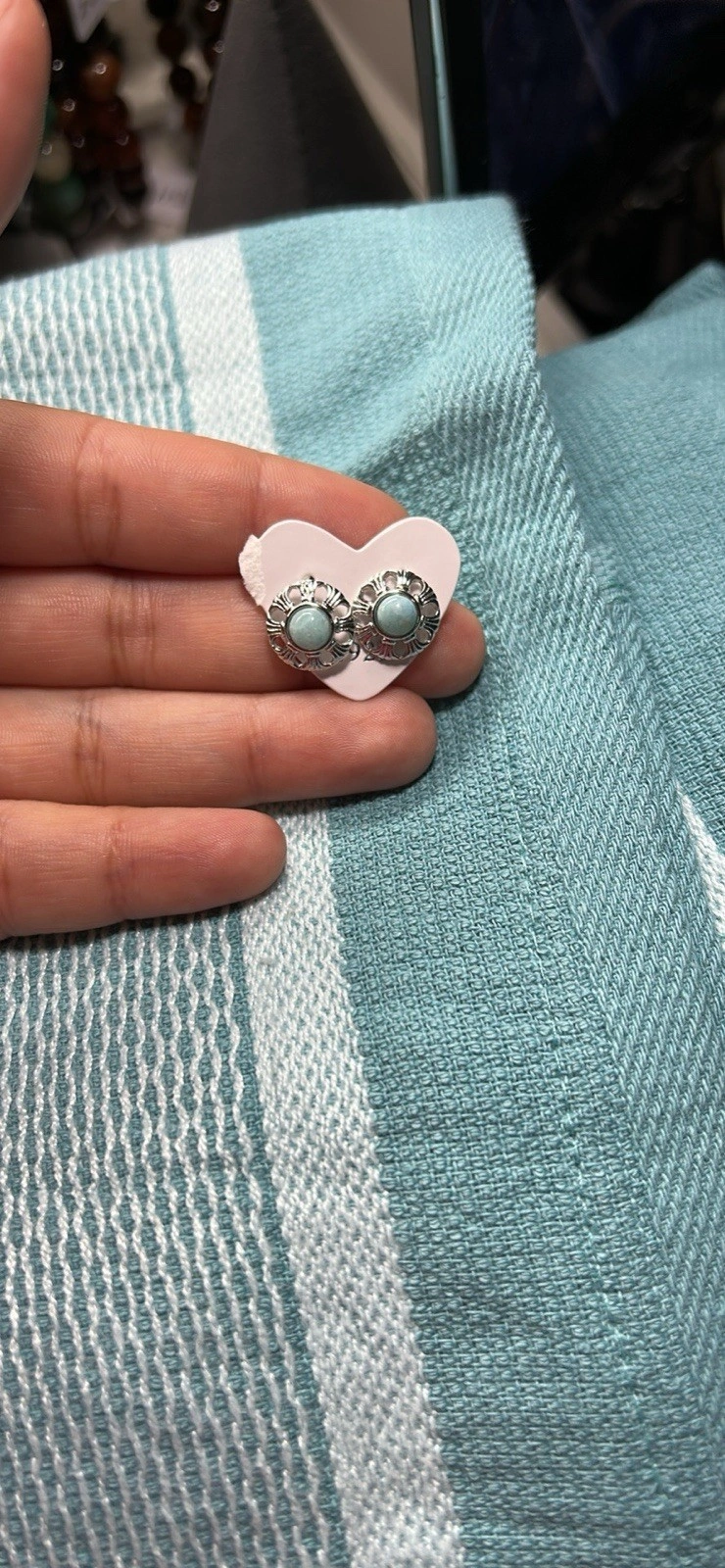 Silver tone stud earrings with a light blue round stone in a bezel setting. Butterfly closure. 2 gemstones.