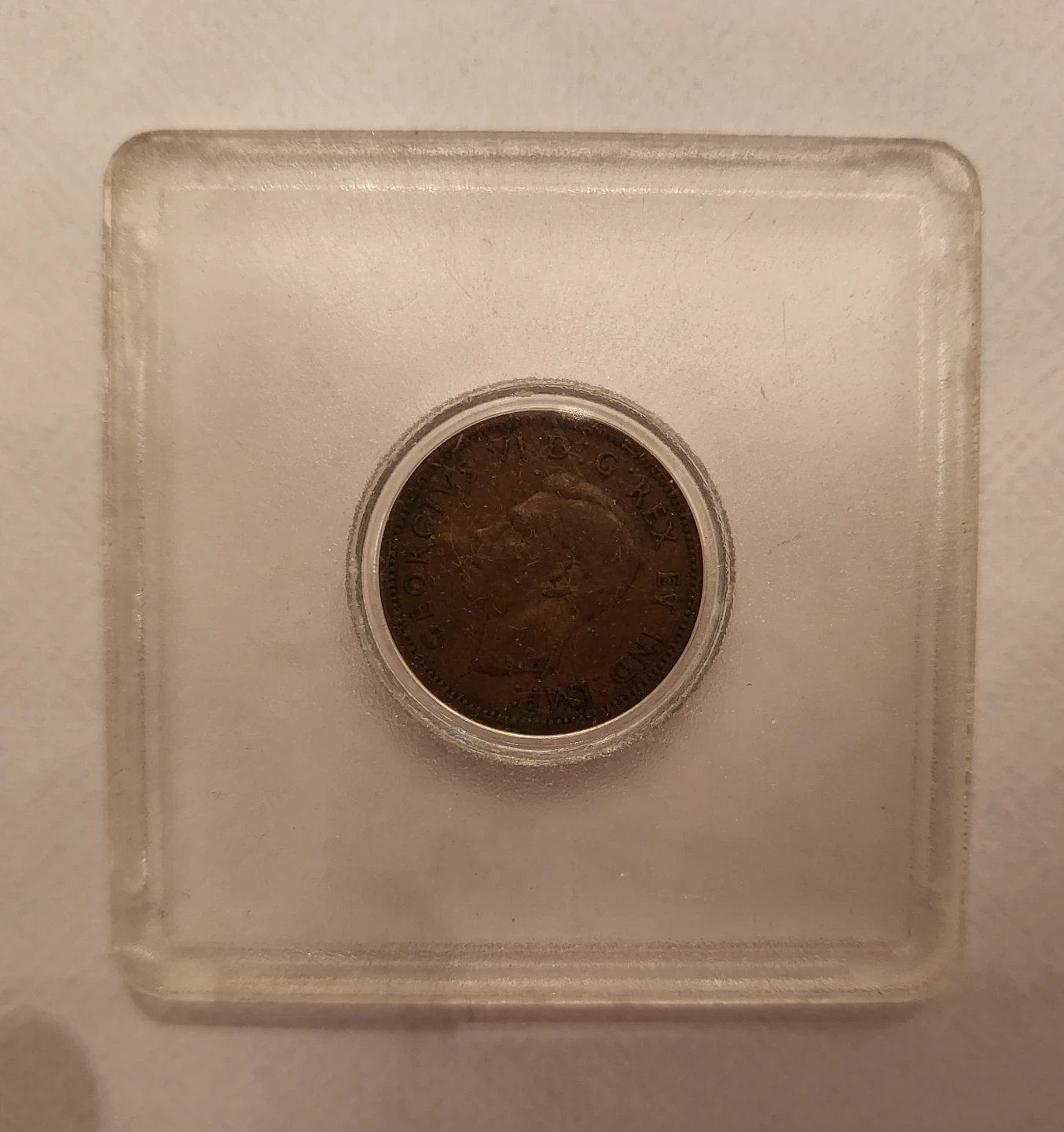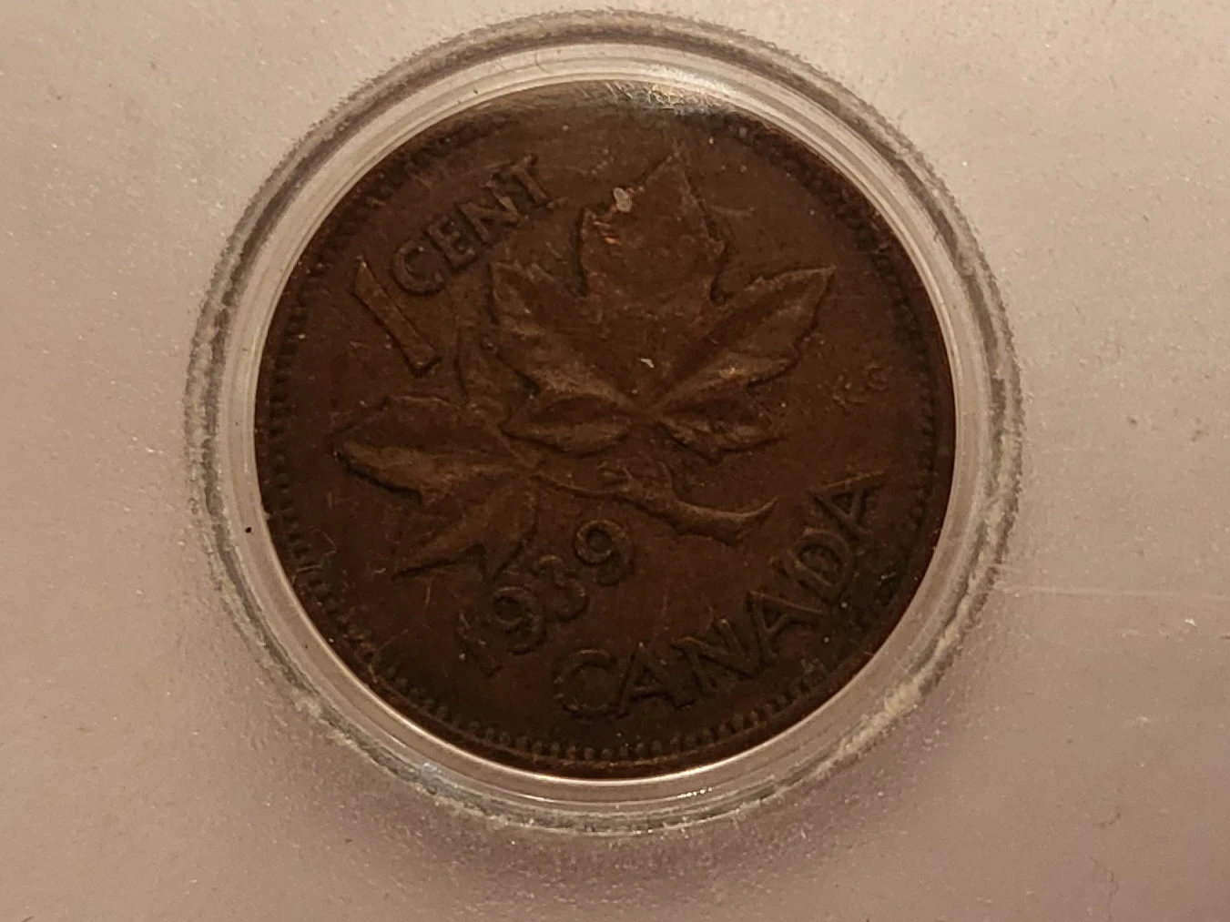 A 1939 Canadian 1 cent coin featuring George VI on the obverse and a maple leaf on the reverse. This coin is housed in a protective plastic case. It's made of bronze. $5