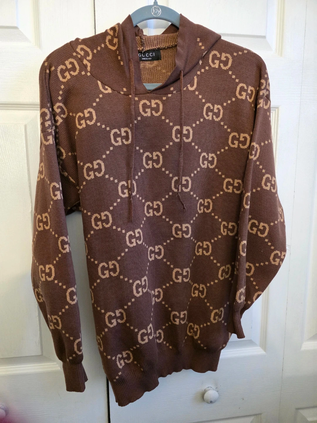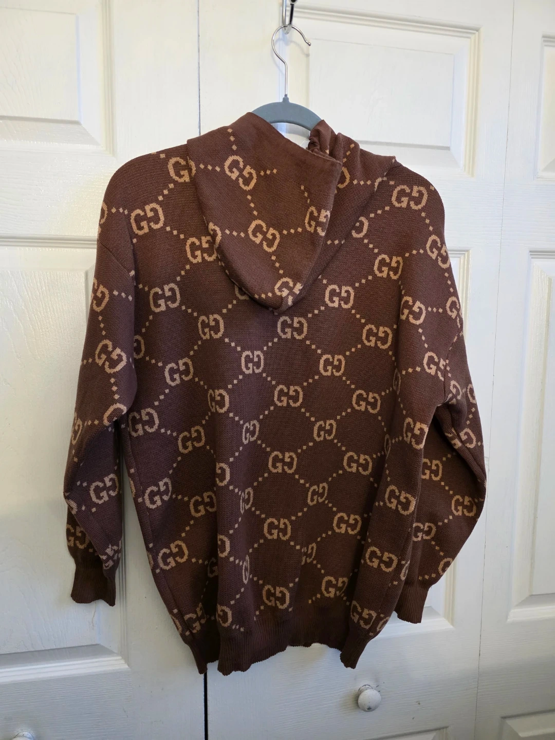 Selling a stylish Gucci hoodie with an all-over print design. The hoodie is brown with a lighter brown pattern. It's in great condition and ready for a new owner!