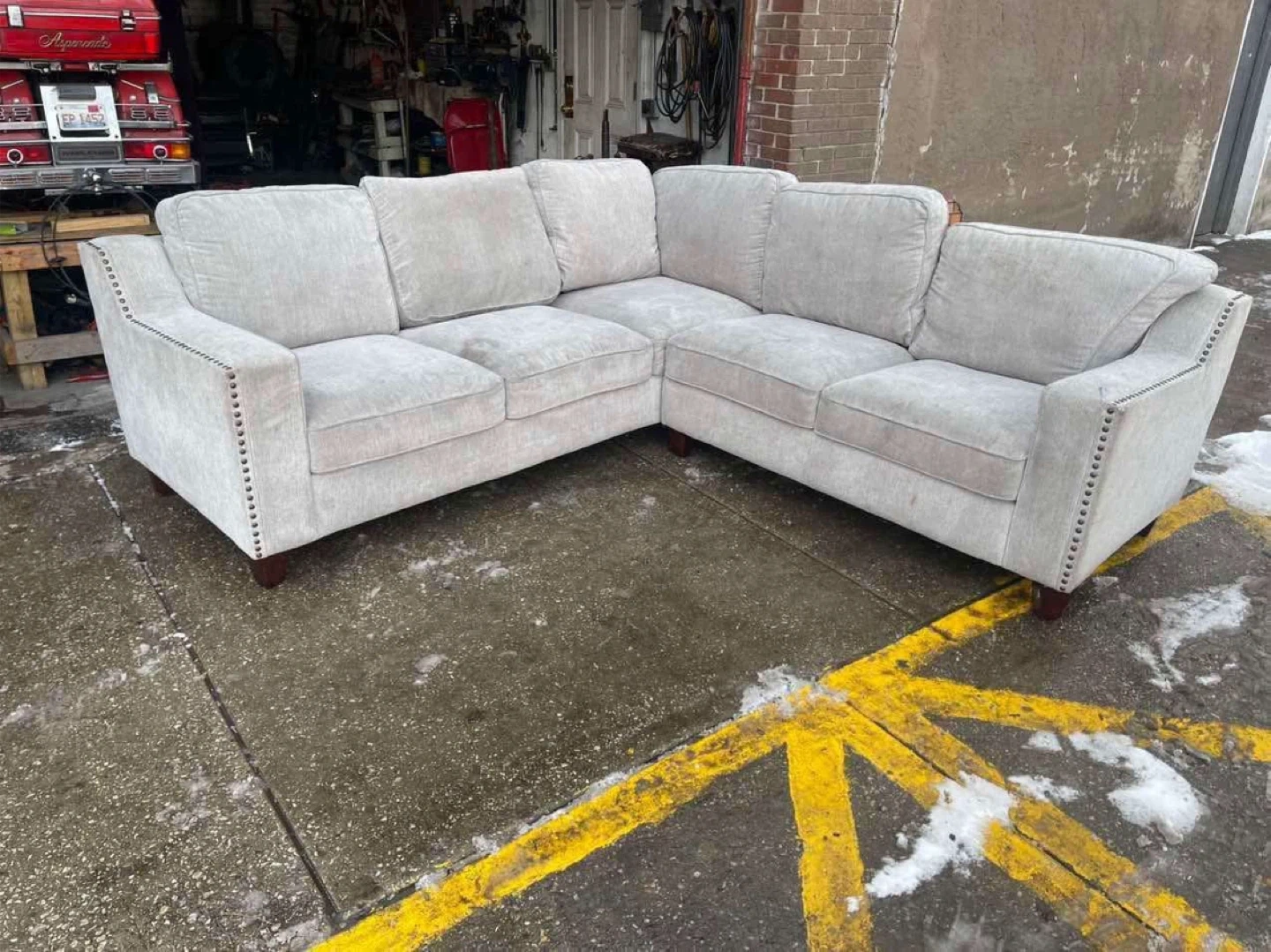Selling a comfortable light gray sectional sofa! It's in good condition and would be a great addition to any living room or den. The sofa features a stylish design with nailhead trim along the arms. Perfect for lounging or entertaining guests!