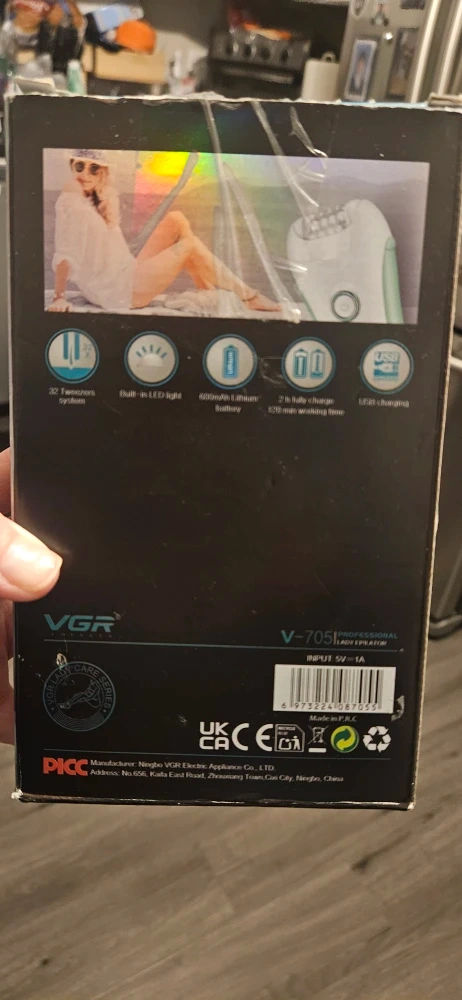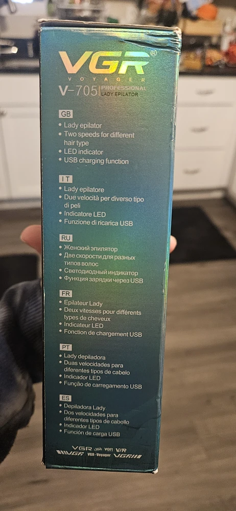 Selling a VGR V-705 Professional Lady Epilator. It features a 32 tweezers system, 2 speed settings, a 600mAh lithium battery, and USB charging function. It also has a built-in LED light. The epilator is designed for lady epilation and is suitable for different hair types