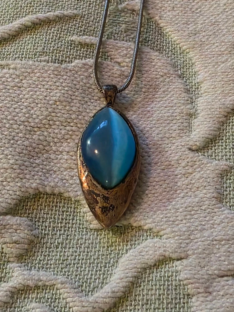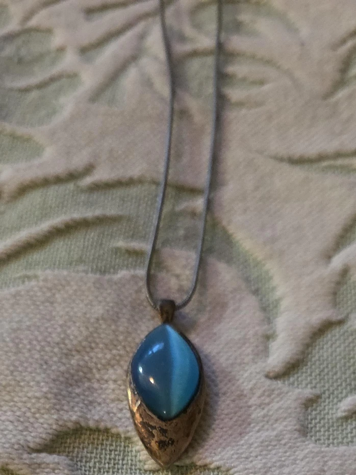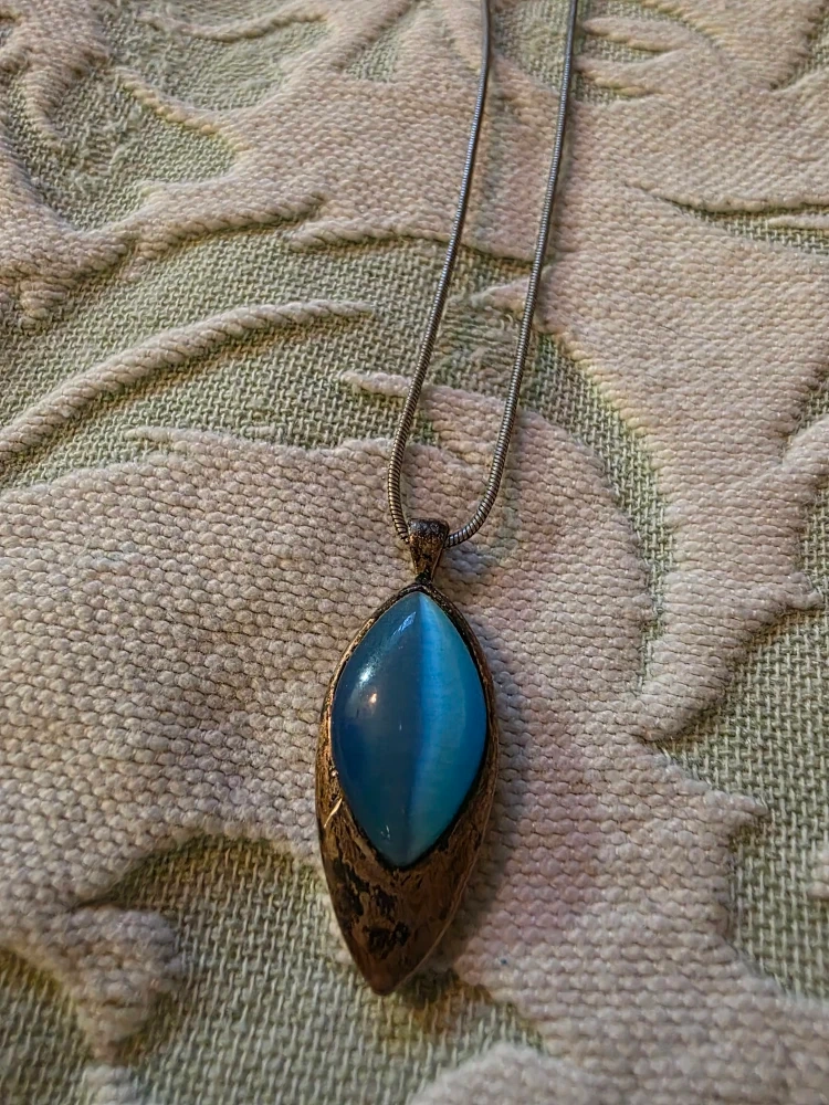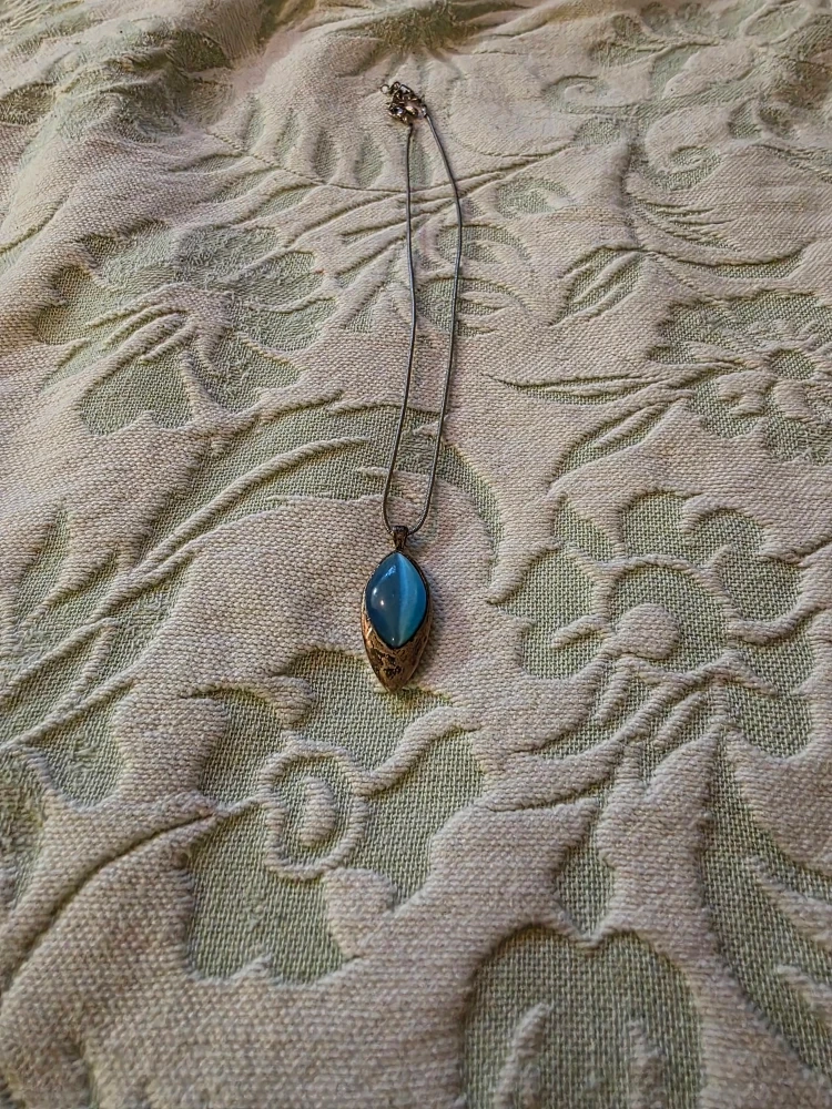Here's a lovely necklace with a blue stone pendant! It has a unique design and would make a great addition to any outfit. It's in good condition just needs a good cleaning as its a little bit tarnished.