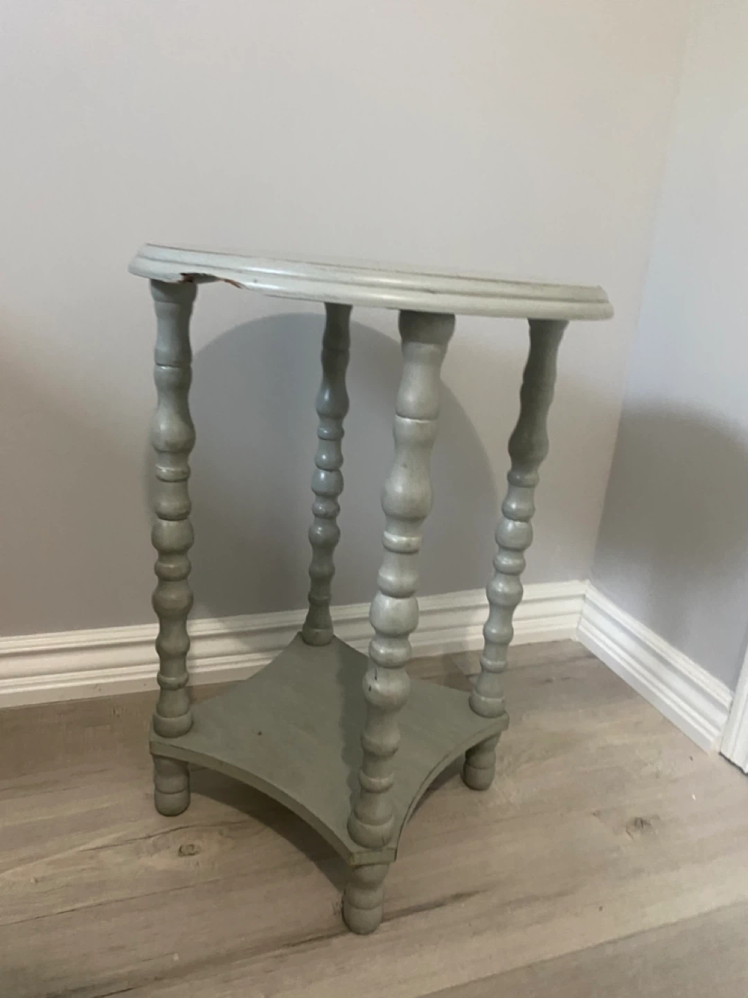 A cute round side table, painted in a greyish blue colour! It has a shelf underneath for extra storage or decor. Perfect for a living room or bedroom