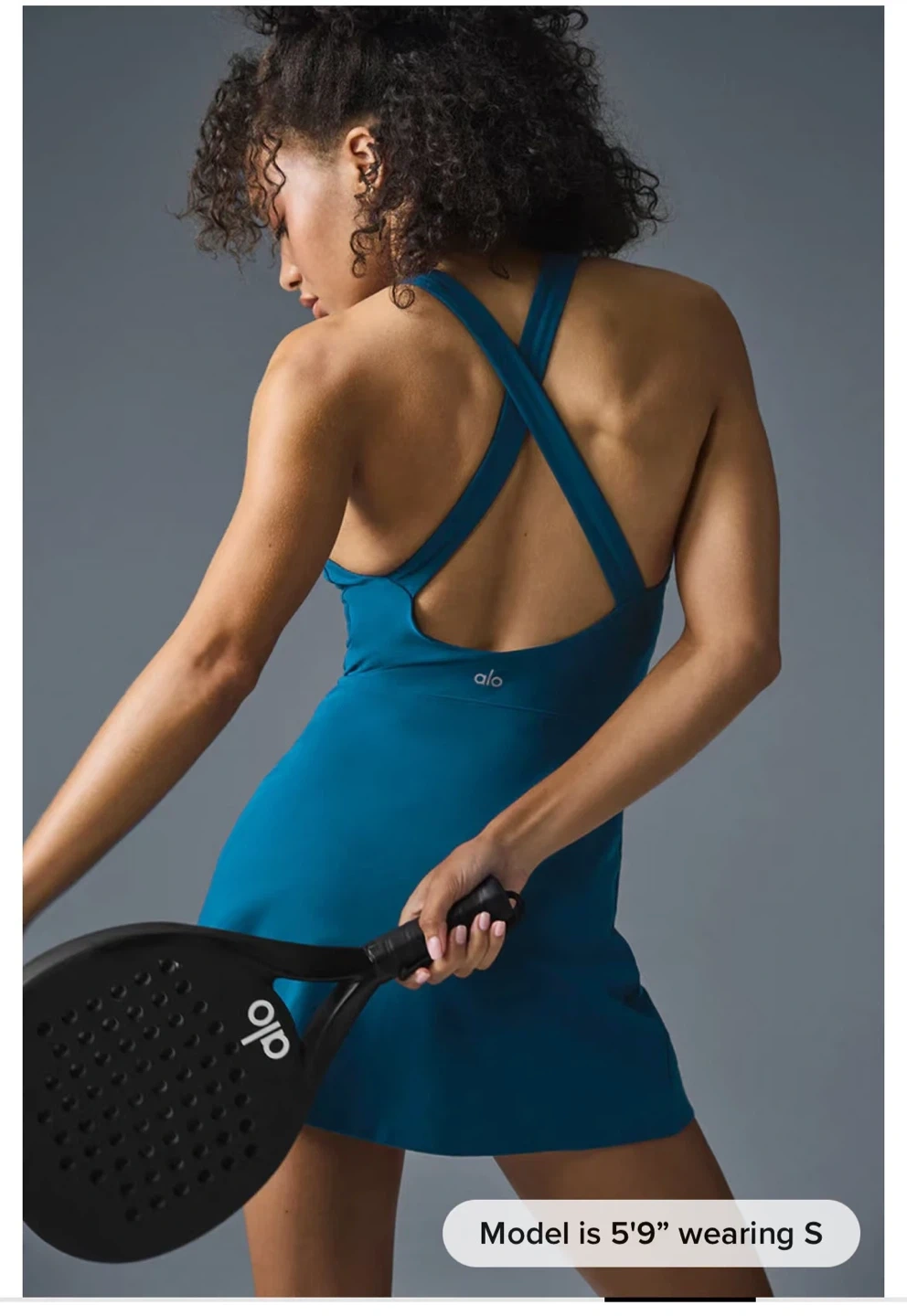This is an ALO Match Point Dress in size small. It's a beautiful teal colour and features a criss-cross back. Perfect for tennis or any other sporty activity!