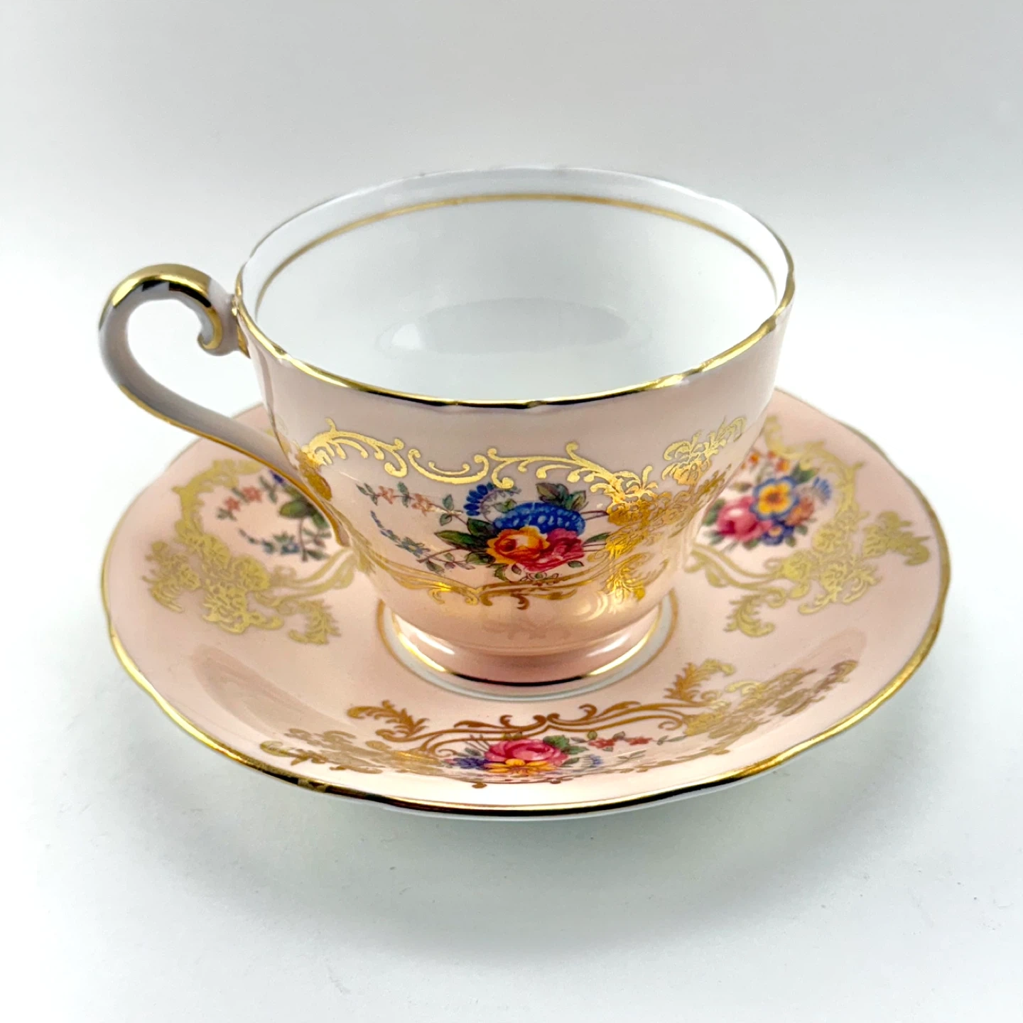 Aynsley (made in England) fine bone china cabinet teacup. Ecru pink with gold scrollwork and flower cameos. No chips, cracks, crazing or gold loss. Both pieces ping/ring