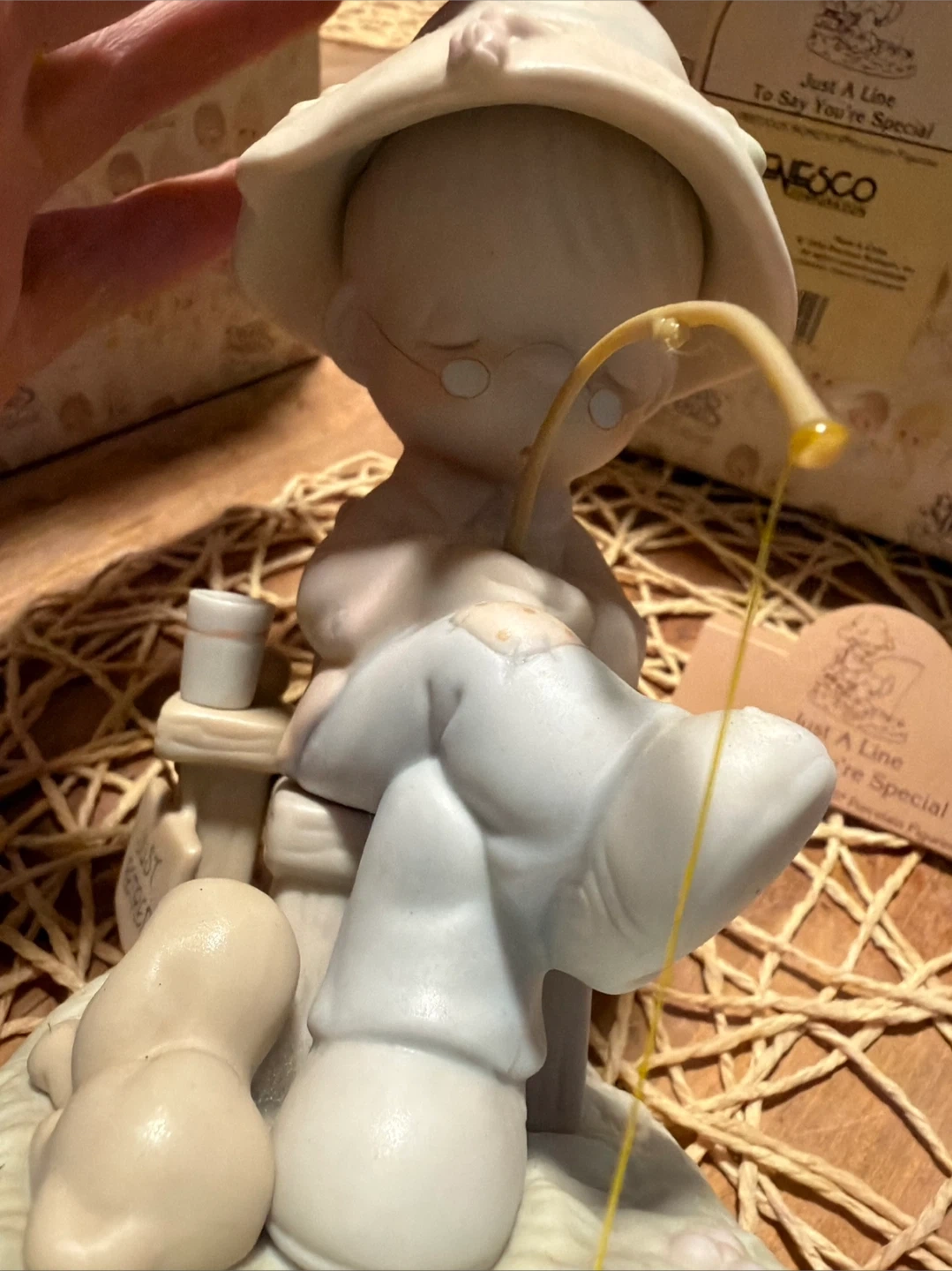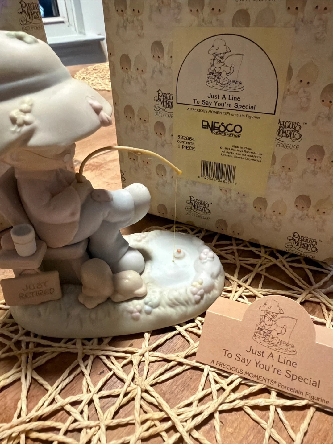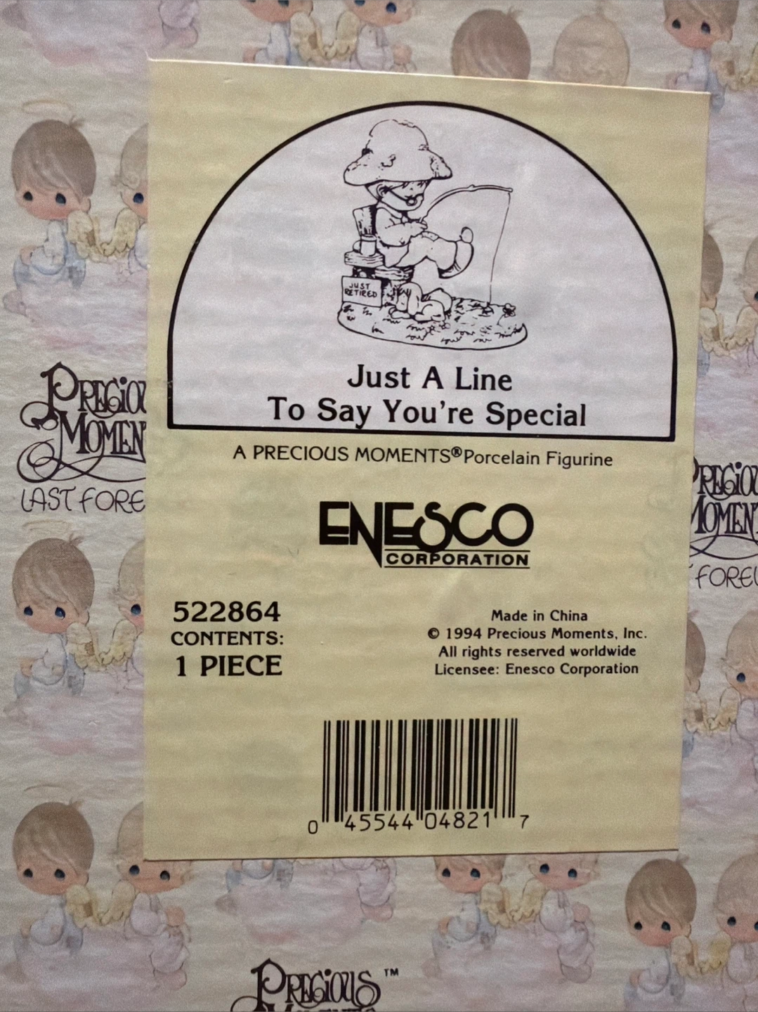This is a Precious Moments porcelain figurine titled "Just A Line To Say You're Special". It features a boy fishing with a dog sleeping nearby. The figurine is marked with the item number 522864 and comes with its original box