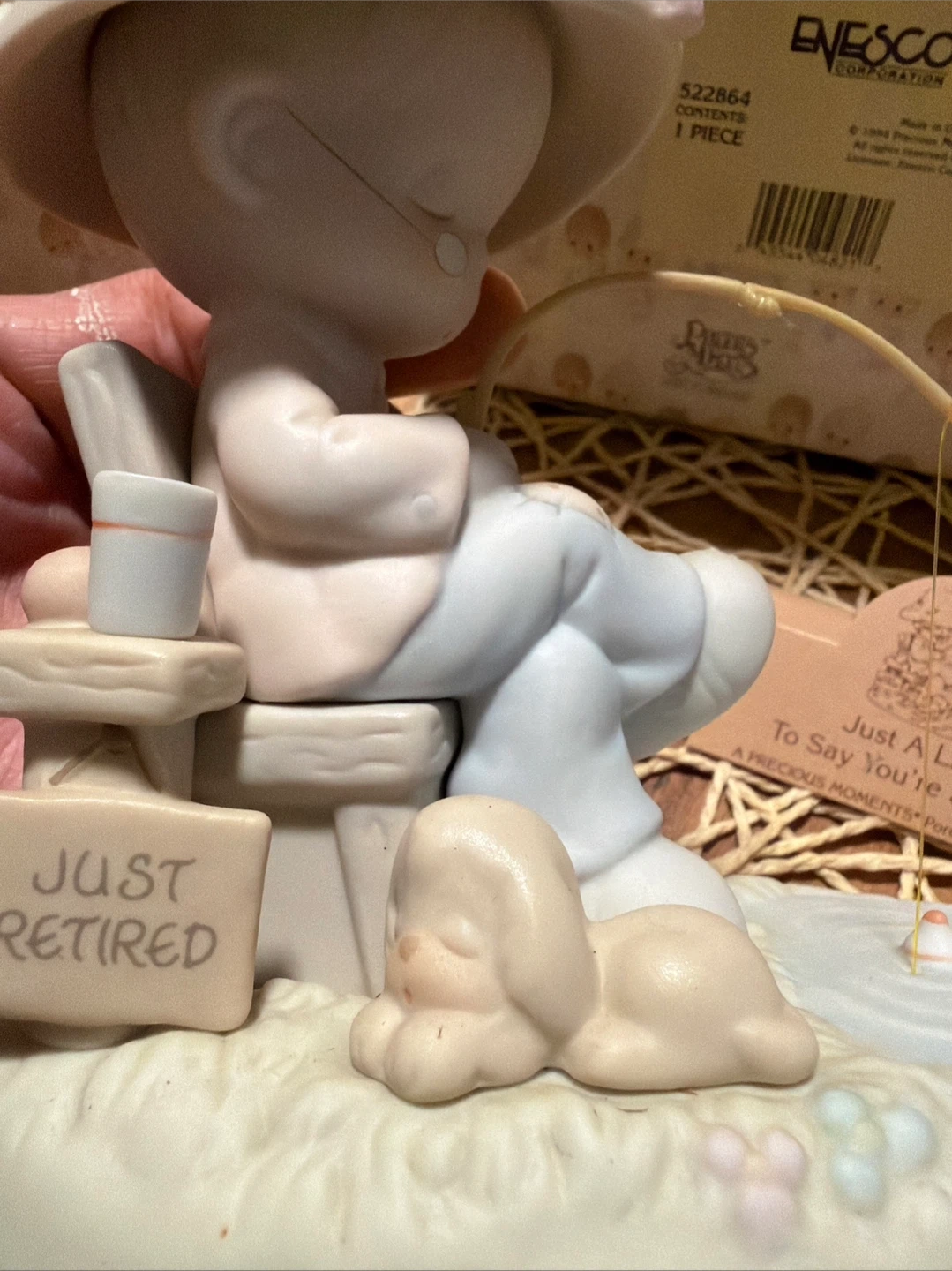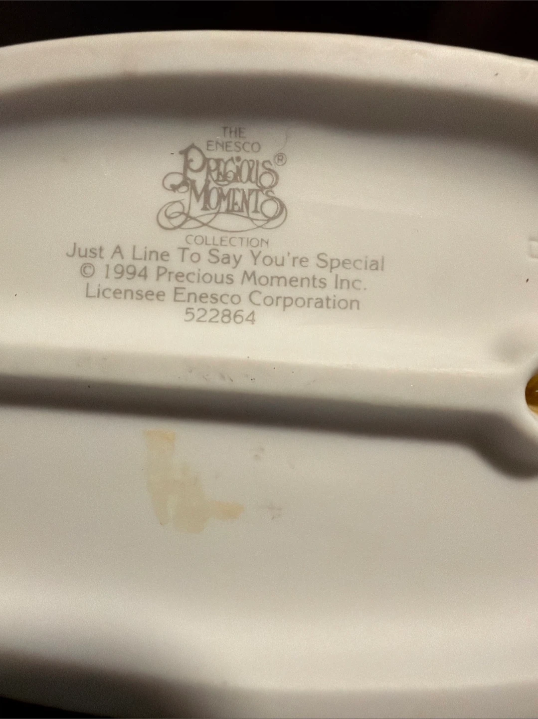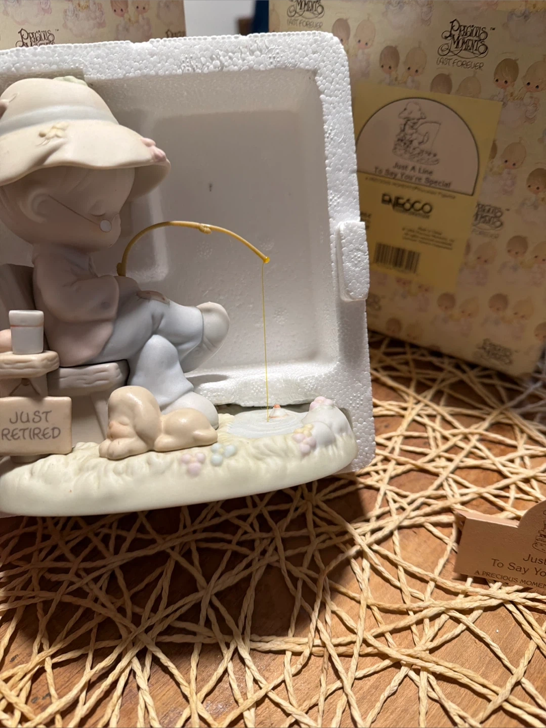This is a Precious Moments porcelain figurine titled "Just A Line To Say You're Special". It features a boy fishing with a dog sleeping nearby. The figurine is marked with the item number 522864 and comes with its original box