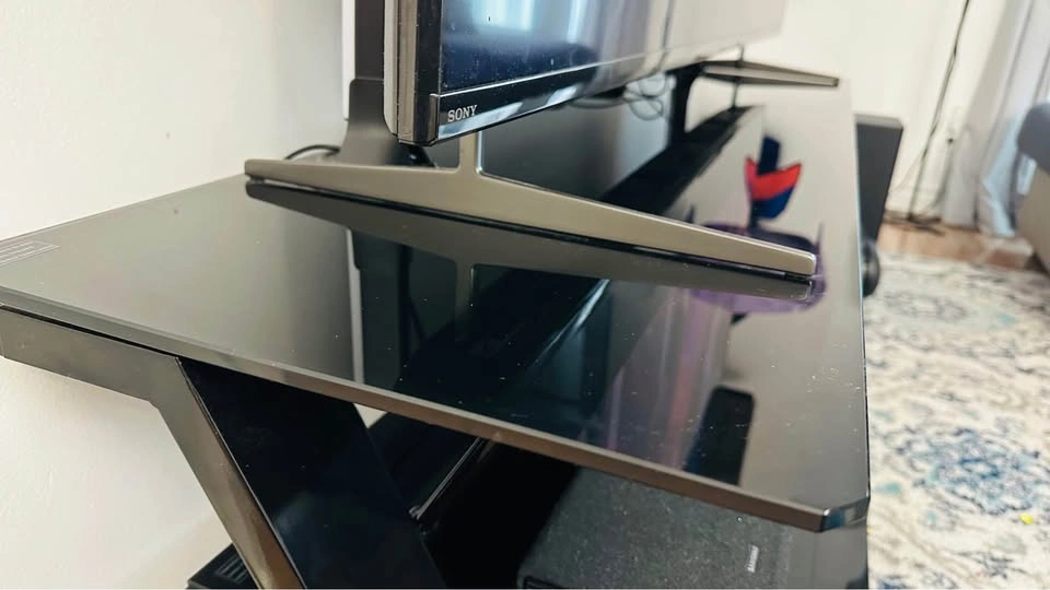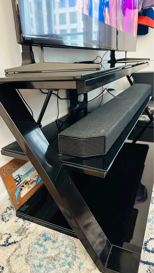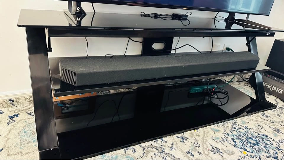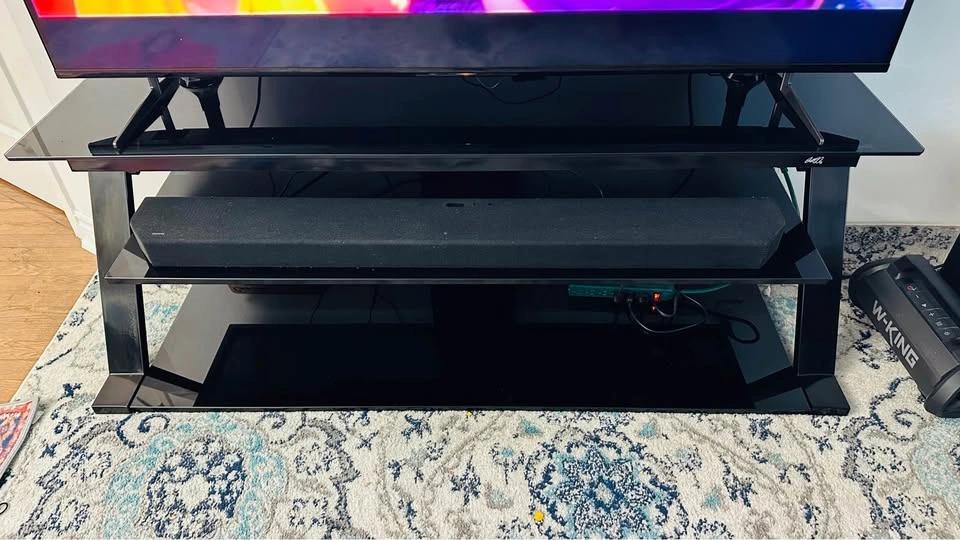 Fits TVs up to 65” and features strong black tempered glass shelves, a metal frame, and a built-in cable management system for a clean setup. Open design helps keep all your components cool.