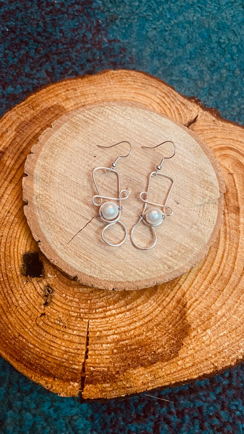 These are some really cute handmade silver earrings! They feature a unique design with a pearl accent. Perfect for adding a touch of elegance to any outfit