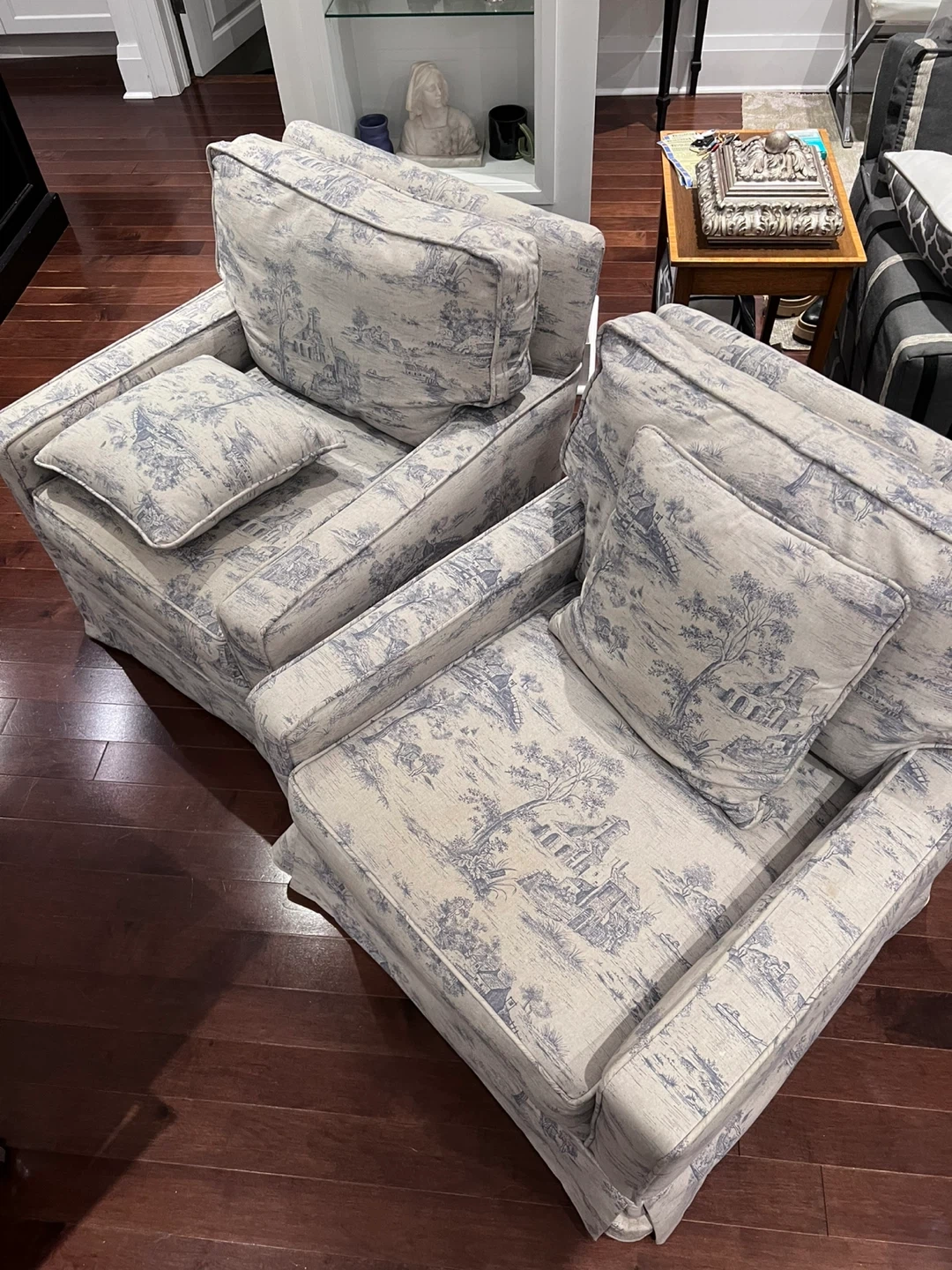 Selling two comfy armchairs with matching throw pillows! The chairs have a lovely pattern and look great in any living room or den. It's in good condition and ready for a new home. Casters on the bottom of both chairs.