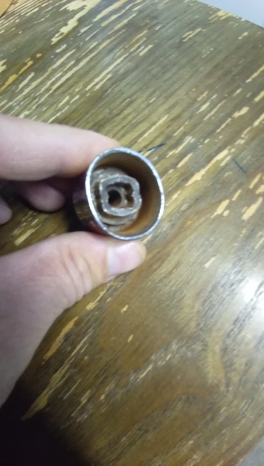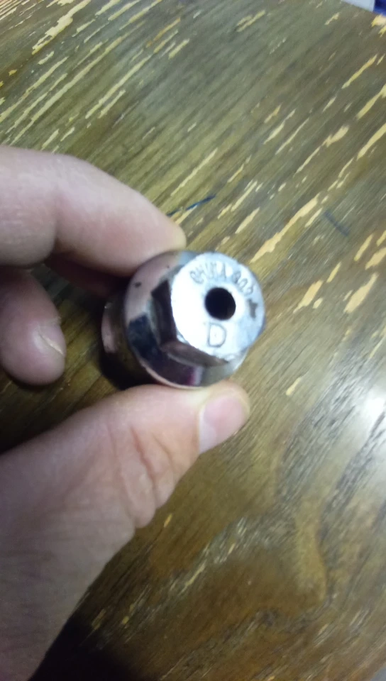 This is a lug nut with the letter D on it. It appears to be in used condition.
