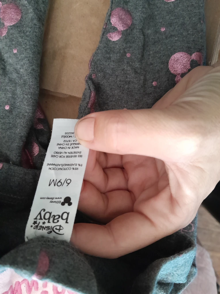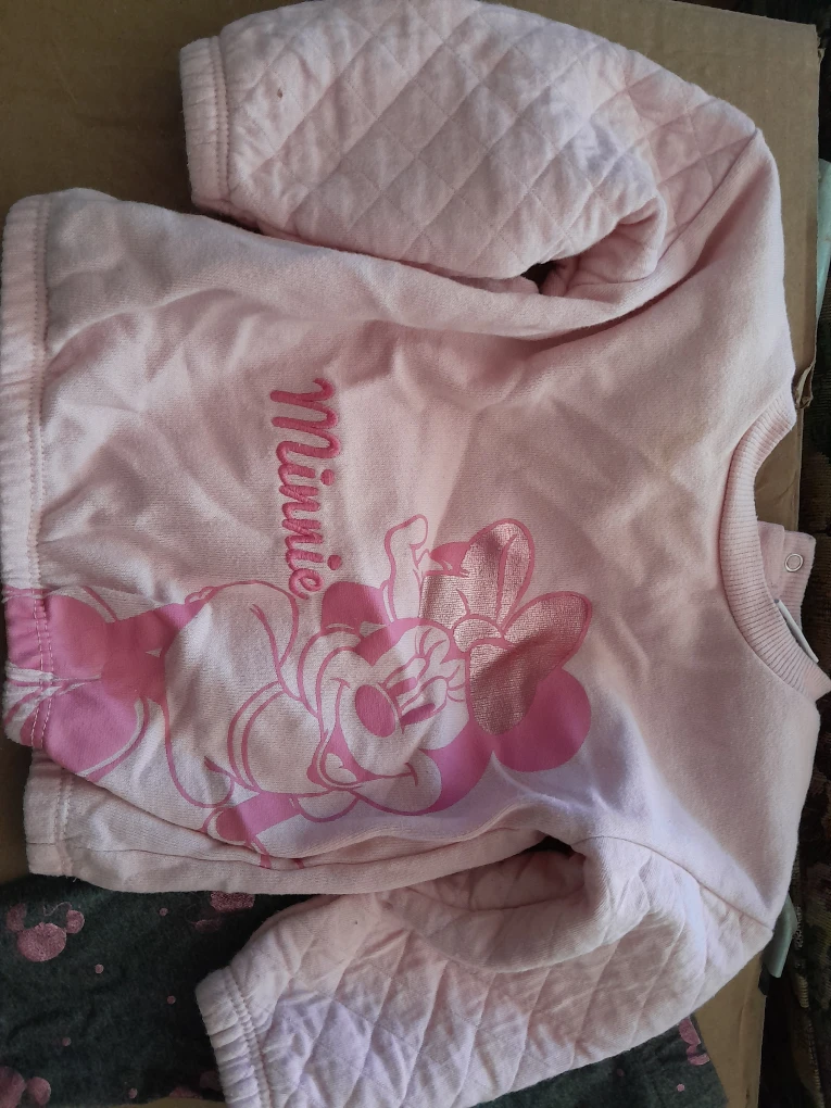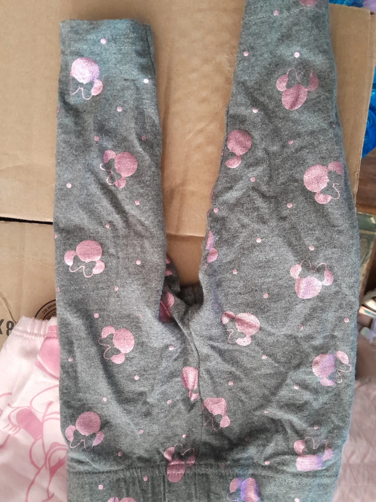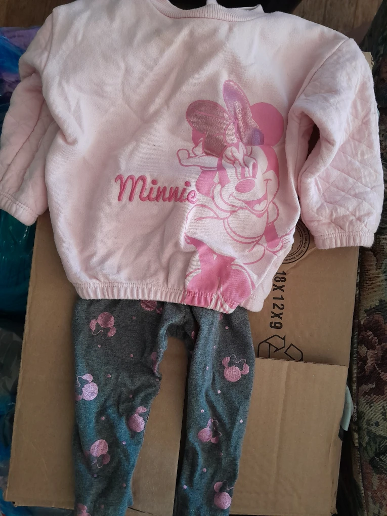 Super cute Disney Baby outfit featuring Minnie Mouse! The set includes a pink top and grey leggings, both in size 6-9 months. Perfect for your little one!