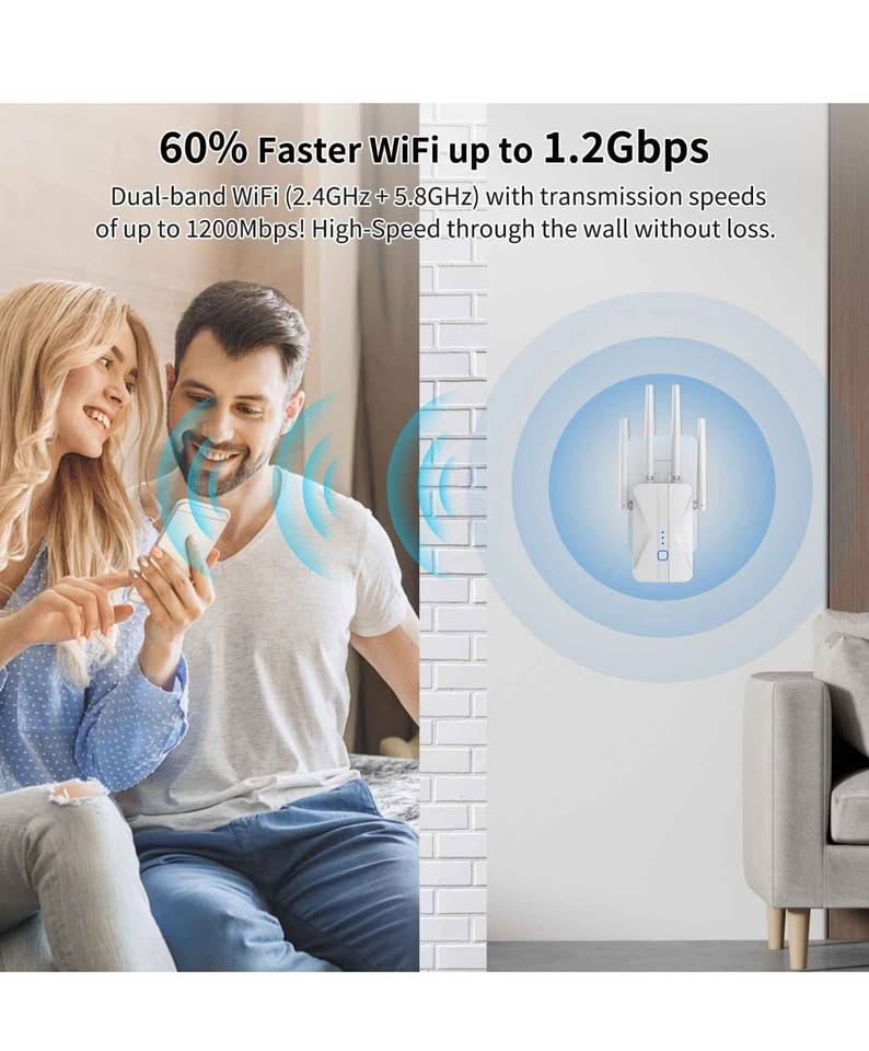 WiFi Extender Signal Booster, 2025 WiFi Extender AC1200Mbps Dual Band (5.8GHz/2.4GHz), WiFi Booster with Ethernet Port for Home Covers up to 10000 Sq.ft, Compatible with More Devices