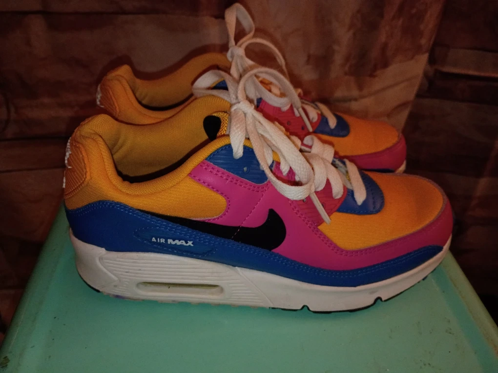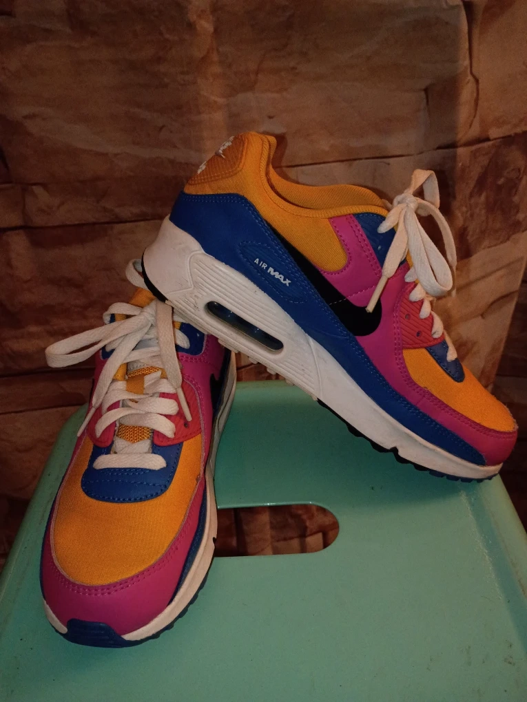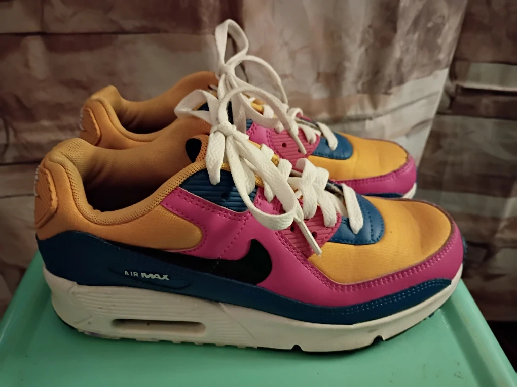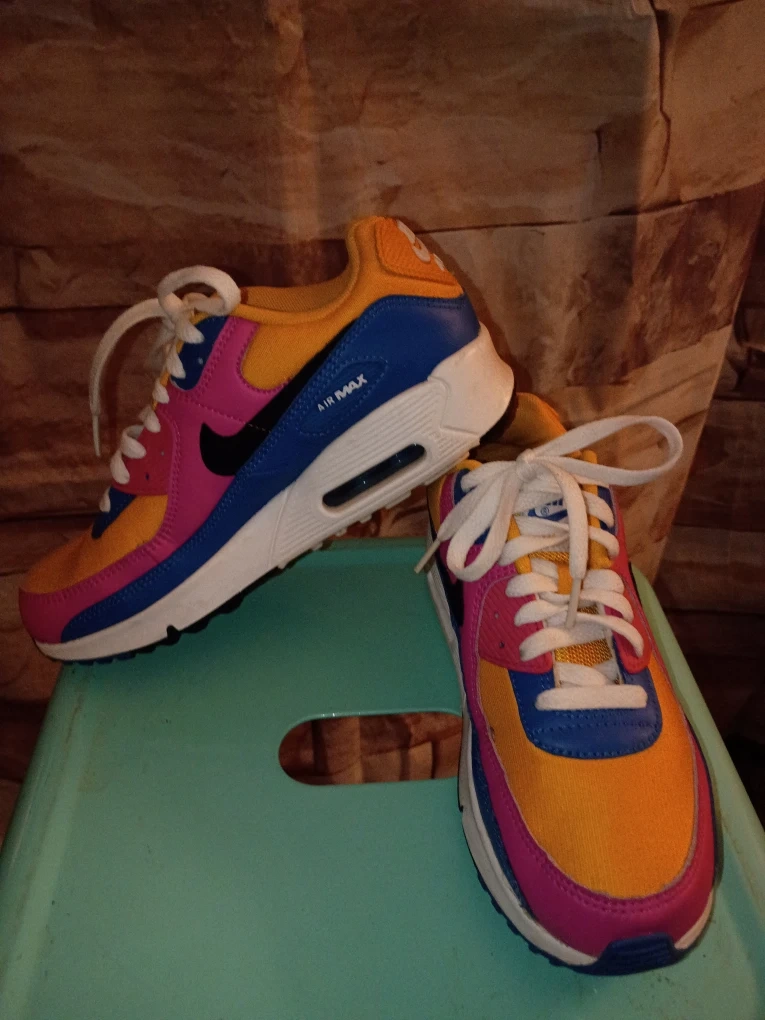 Selling a pair of Nike Air Max 90 sneakers. They feature a fun multi-color design with yellow, pink, and blue accents. The shoes have the classic Air Max cushioning for comfort and style!