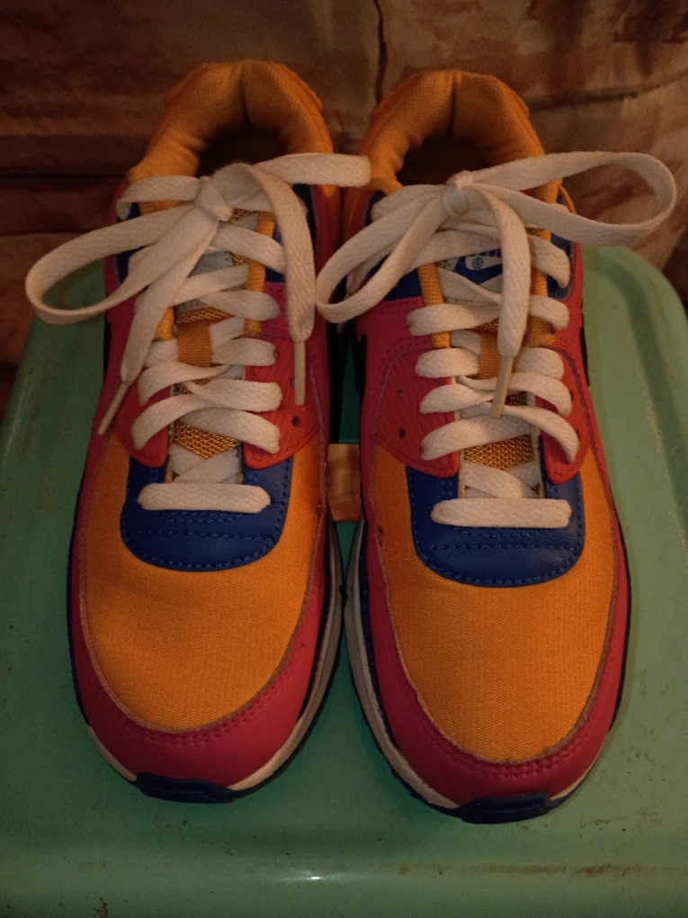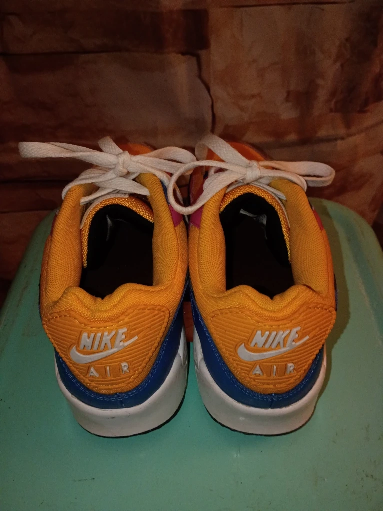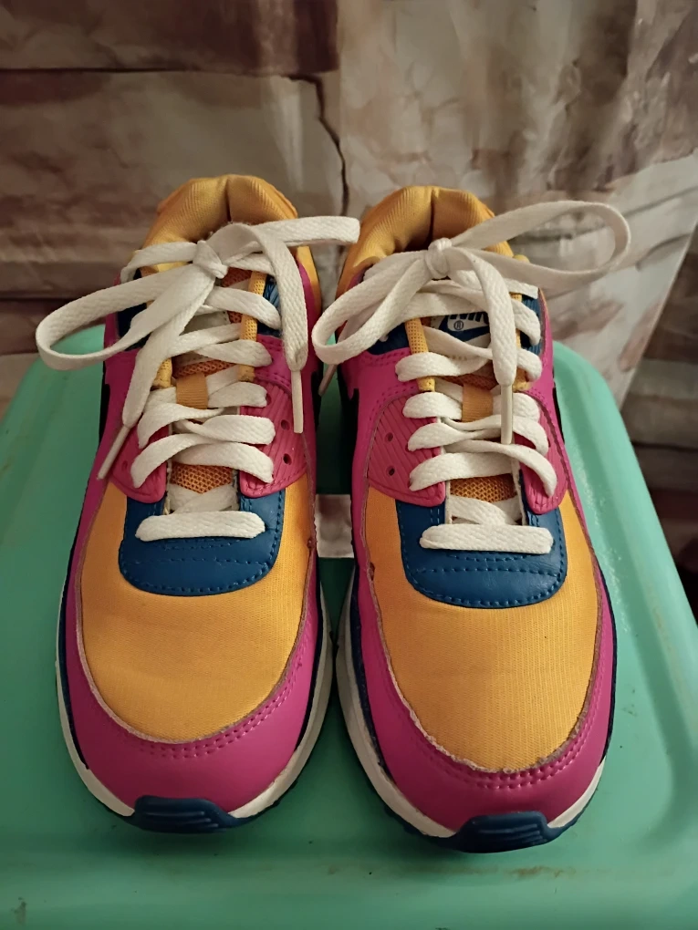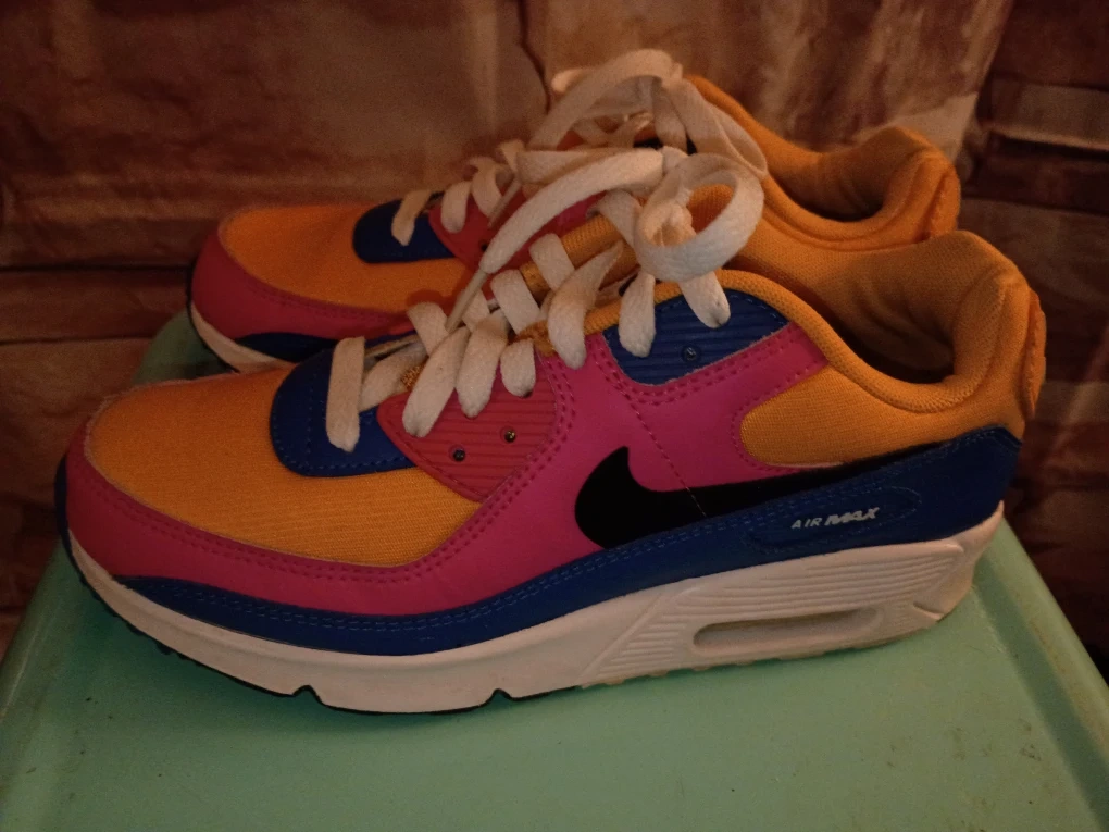 Selling a pair of Nike Air Max 90 sneakers. They feature a fun multi-color design with yellow, pink, and blue accents. The shoes have the classic Air Max cushioning for comfort and style!