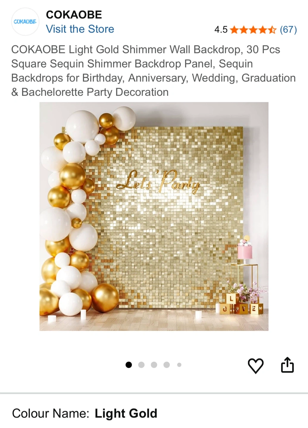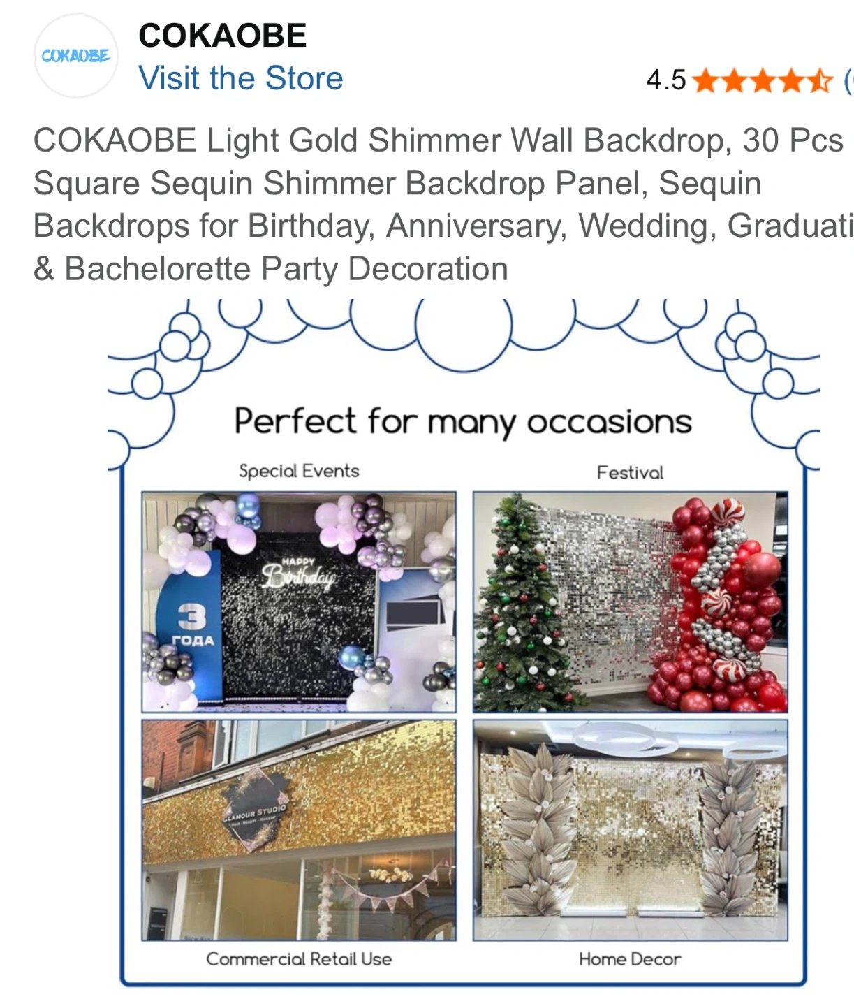 Get ready to add some sparkle to your next event with this COKAOBE Light Gold Shimmer Wall Backdrop! It includes 30 pcs of square sequin shimmer backdrop panels, perfect for birthdays, anniversaries, weddings, graduations, and bachelorette parties. Each panel is lightweight and easy to assemble with quick clip panels. You'll also get wall hooks and zip ties for easy installation