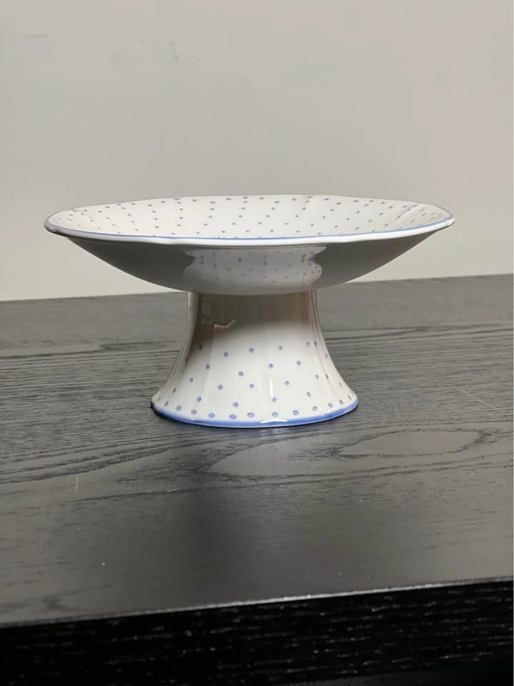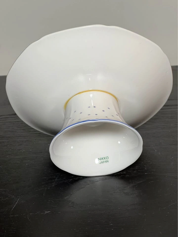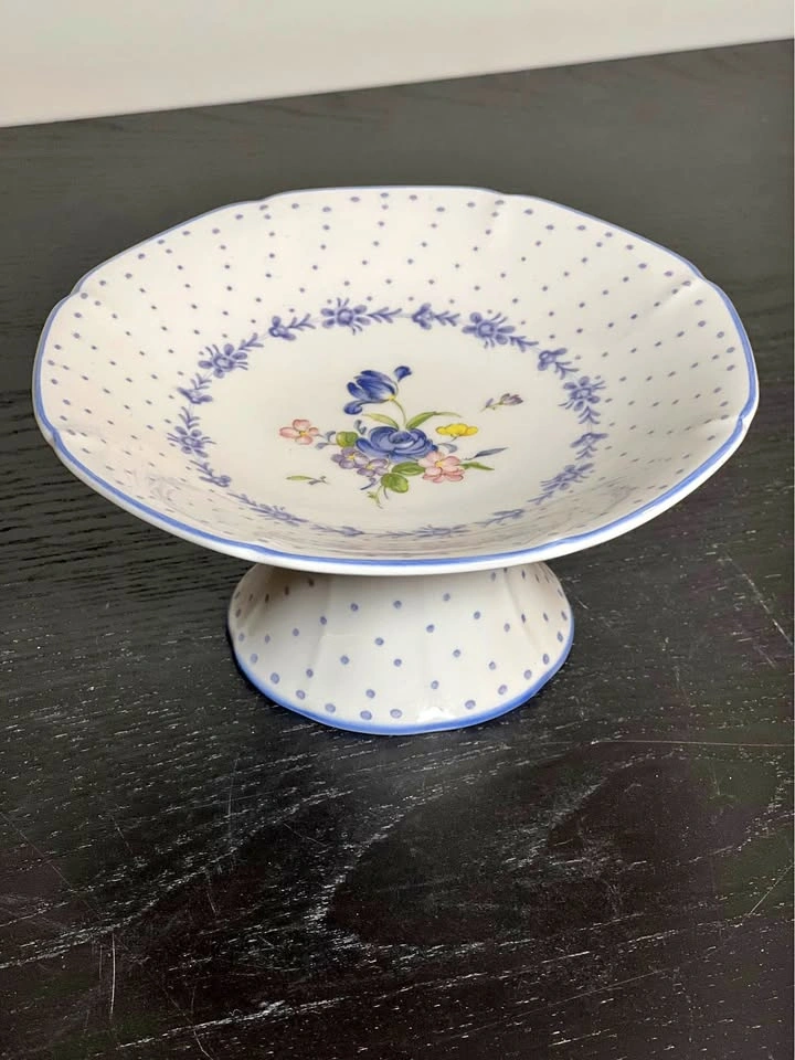 This is a Nikko Blue Peony small candy compote or pedestal dish. It is part of the "Blue Peony" dinnerware pattern produced by Nikko Co., Japan. The design was discontinued in 2014.