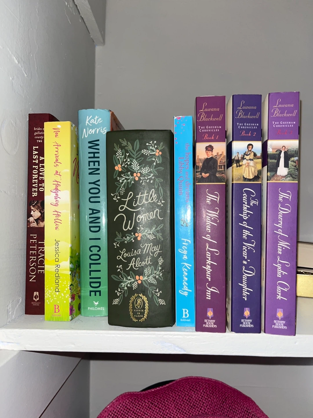 Selling a copy of Little Women by Louisa May Alcott. It's in great condition and ready for a new home! Also available are other books, including The Gresham Chronicles series by Lawana Blackwell, New Arrivals at Hedgehog Hollow by Jessica Redland, and When You and I Collide by Kate Norris