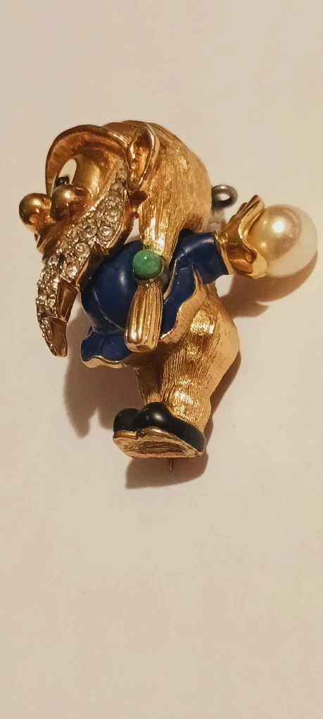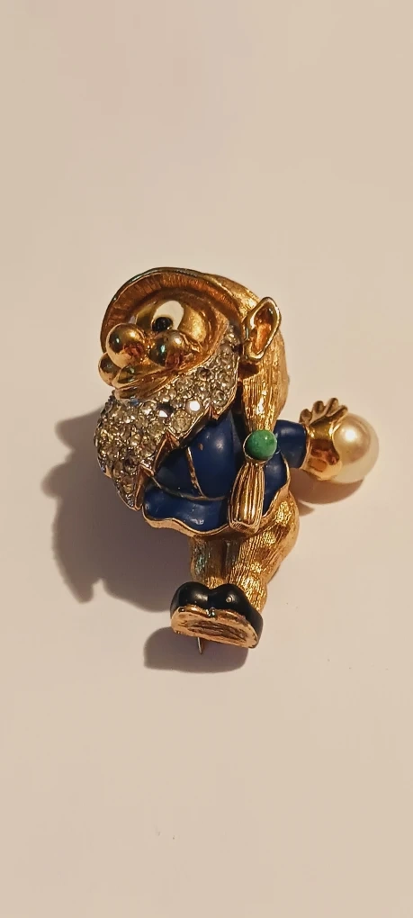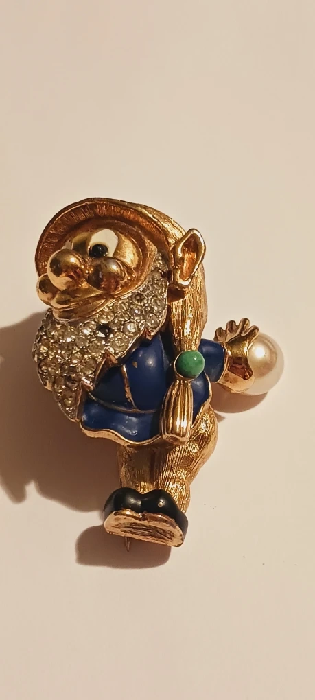MAZER JOMAZ RARE COLLECTIBLE SIGNED 1940s DWARF FROM SNOW WHITE FIGURAL ENAMELED RHINESTONE BROOCH. Rare Collectible Authentic Signed JOMAZ One of the Seven Dwarfs Brooch. This gold plated DWARF brooch is very hard to find. The brooch is in excellent vintage condition. His beard gliters with sparkling crystal pave inset rhinestones. His enamel blue jacket is in great vintage condition and he is holding a large faux pearl as if he is going bowling. This whimsical little guy is 2"×1.5".The brooch is signed on the back JOMAZ. It's in good vintage condition and ready to add some whimsy to your collection! Excellent condition. ALL MY PRICES ARE NEGOTIABLE !!