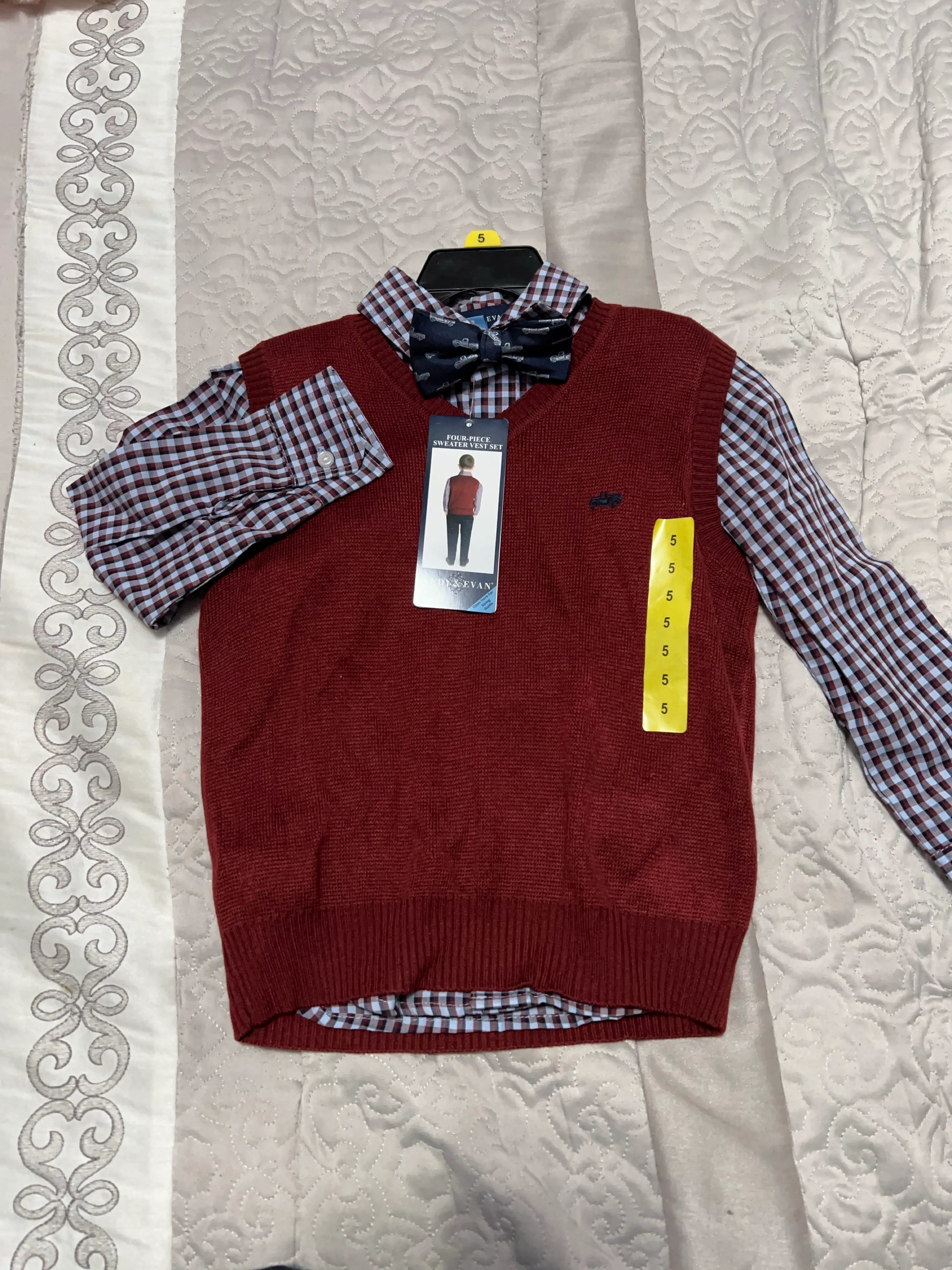 This is a brand new, four-piece sweater vest set from Andy & Evan! It includes a sweater vest, shirt, and bowtie. The set is size 5 and still has the original tags attached.
