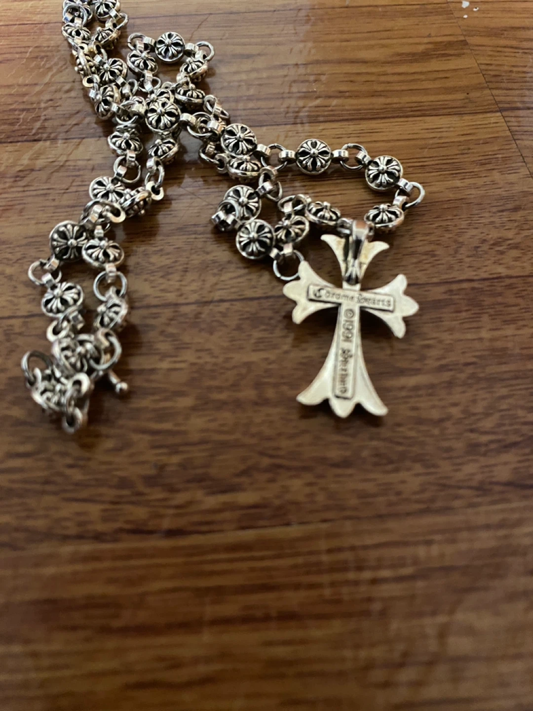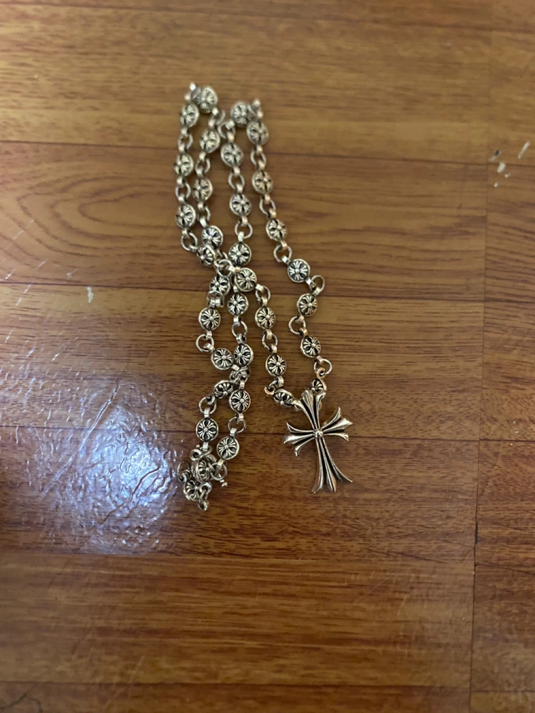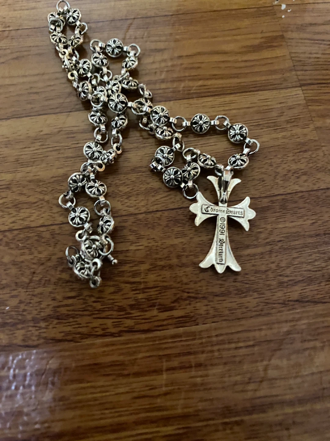 Selling a Chrome Hearts cross necklace. It's in good condition. The necklace features a cross pendant and a beaded chain. A stylish accessory to elevate your look!