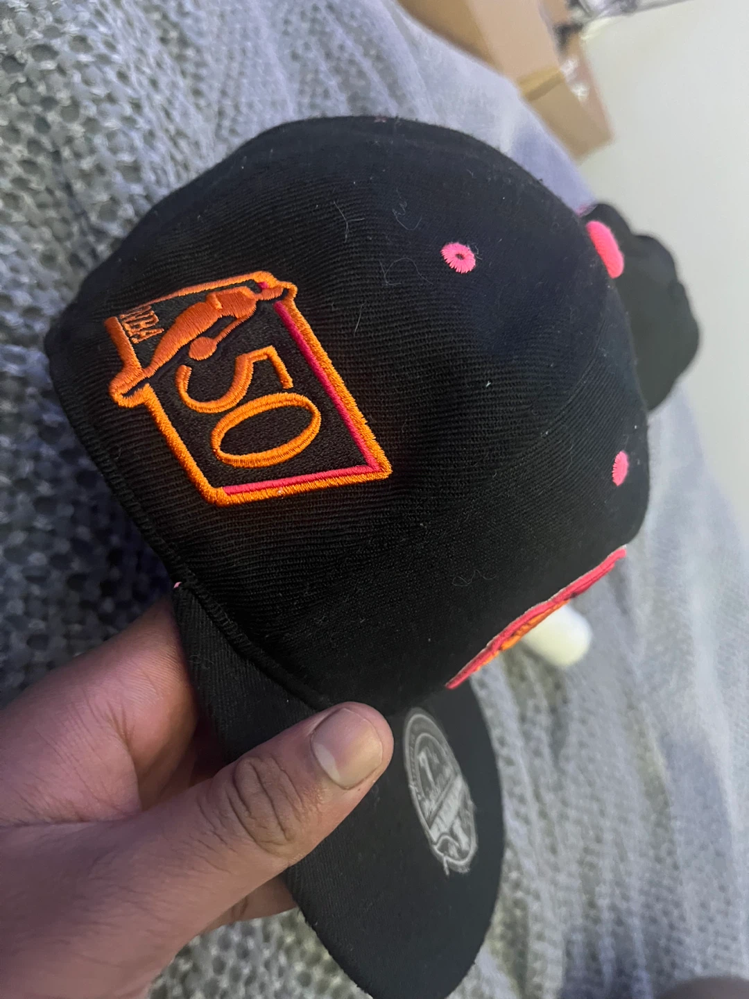 Selling a Mitchell & Ness Toronto Raptors 50th anniversary hat. It's a fitted hat, size 7 1/4. The hat is black with pink accents and features the Raptors logo. Great for any Raptors fan!