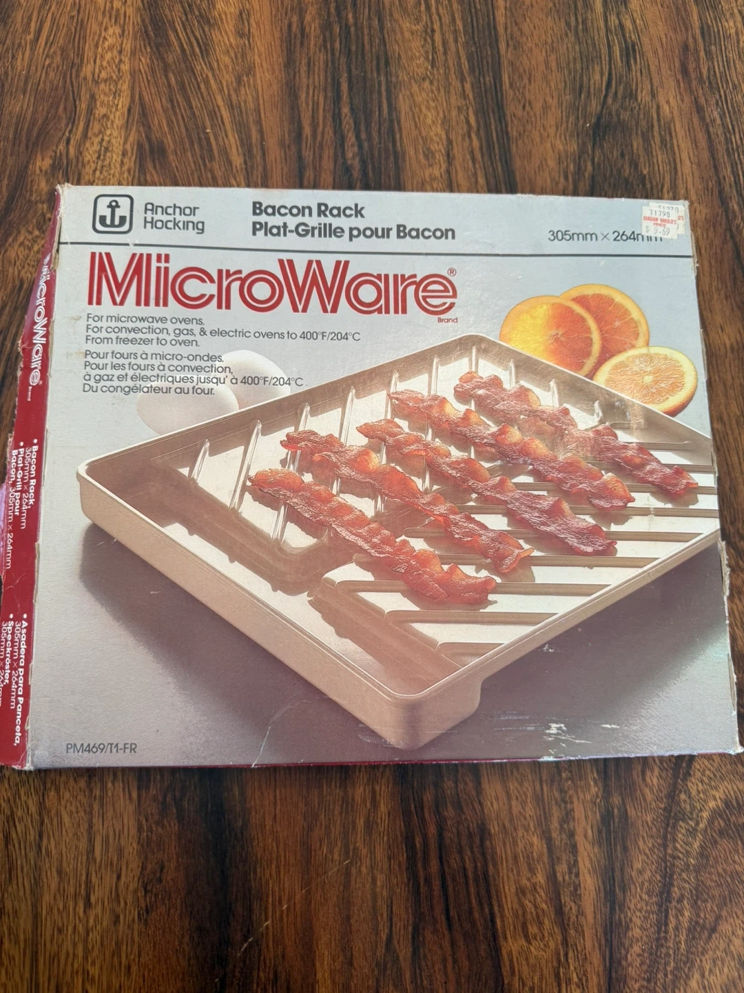 Selling an Anchor Hocking MicroWare Bacon Rack! It's in great shape and ready for a new home. The dimensions are 305mm x 264mm. Perfect for cooking bacon in the microwave!