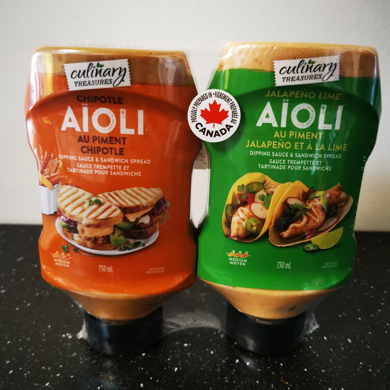 Selling a Culinary Treasures Aioli 2-pack, including Chipotle and Jalapeno Lime flavours. Each bottle contains 750 mL of delicious dipping sauce and sandwich spread. The Chipotle Aioli has a best before date of May 23, 2026, and the Jalapeno Lime Aioli has a best before date of May 22, 2026