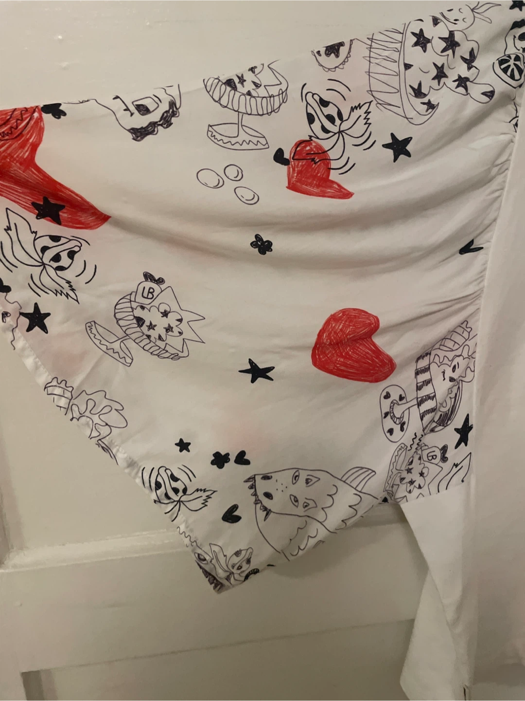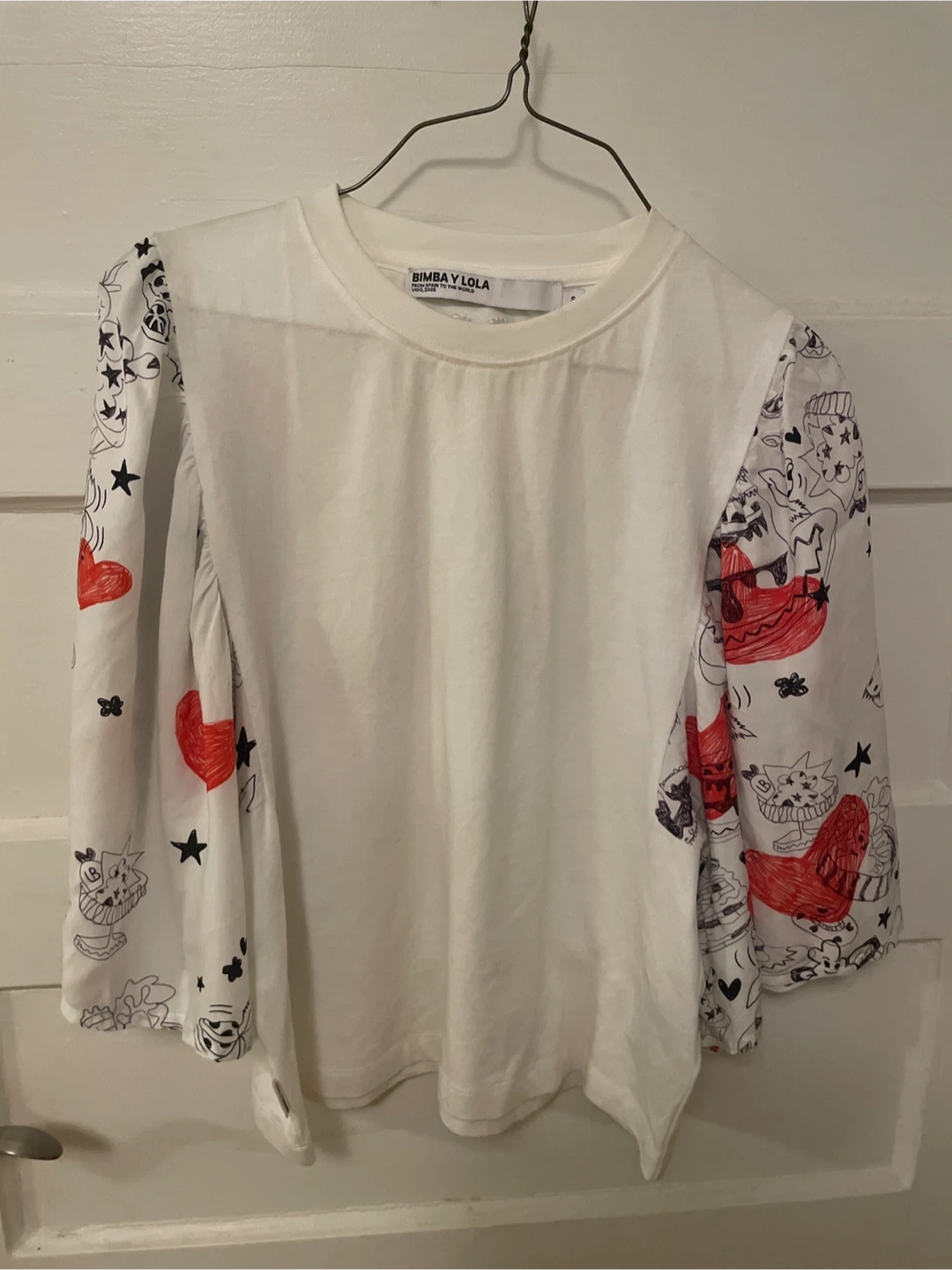This is a Bimba Y Lola top featuring unique printed sleeves! It's a size small and in great condition. The sleeves have red and black designs on a white background, adding a playful touch to the classic white top.