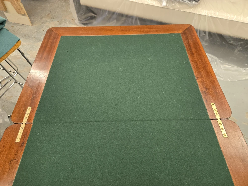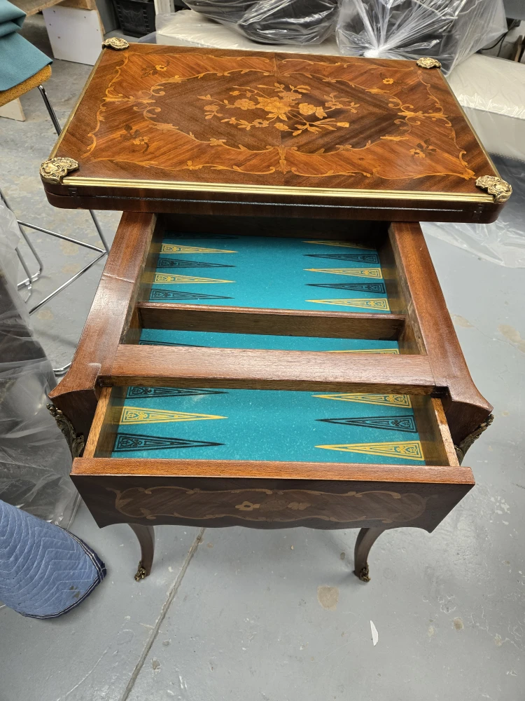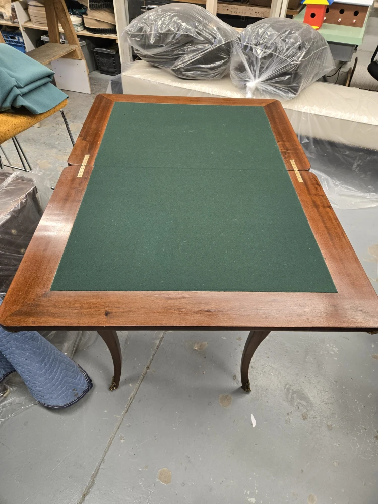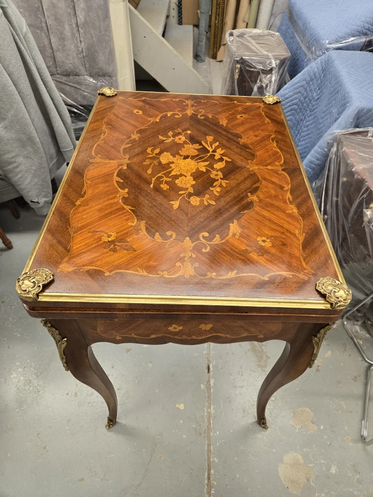 Selling an antique folding game table! It features a beautiful wood inlay design and a green felt playing surface. It can be used as a card table or for board games. The table also has a drawer for storing game pieces or cards
