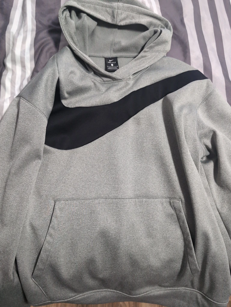 Selling a Nike Dri-FIT hoodie in grey with a black swoosh. It's in great condition and perfect for workouts or casual wear! It's super comfy and stylish too