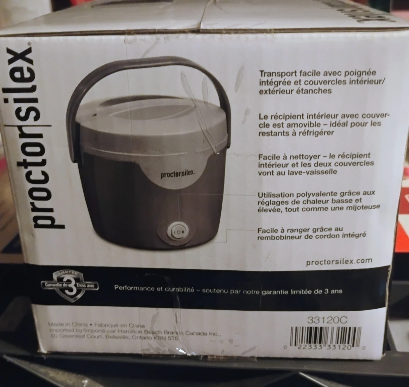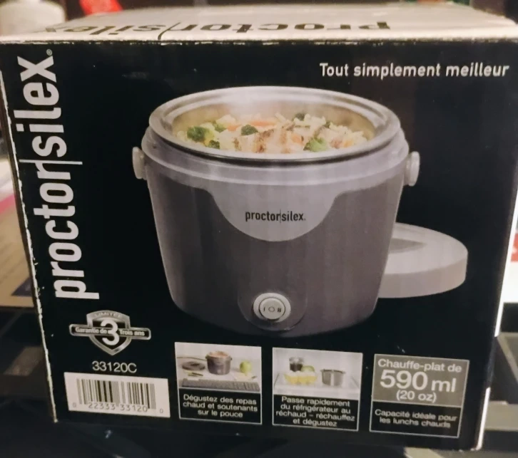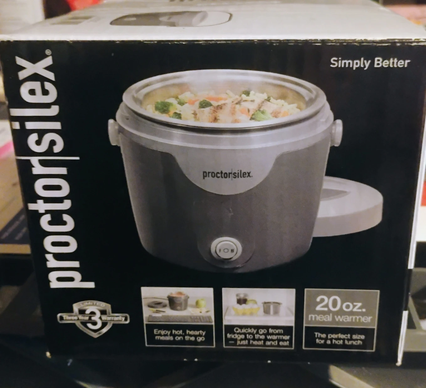 I have a brand new Proctor Silex 20oz meal warmer, model 33120C, still in its original box! It's the perfect size for a hot lunch and great for enjoying hot, hearty meals on the go. It can quickly go from fridge to the warmer - just heat and eat! The warmer has a capacity of 590 ml (20 oz).