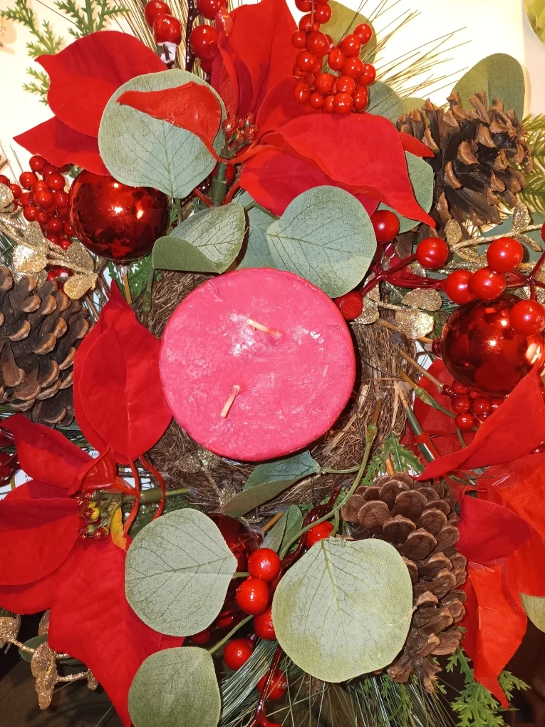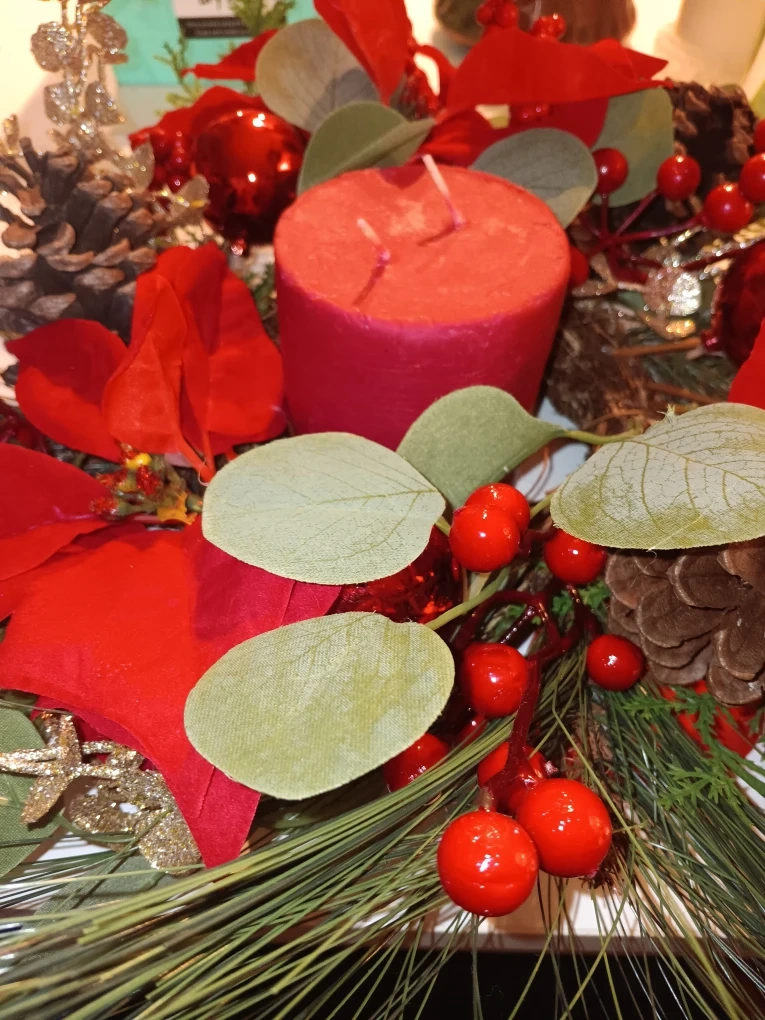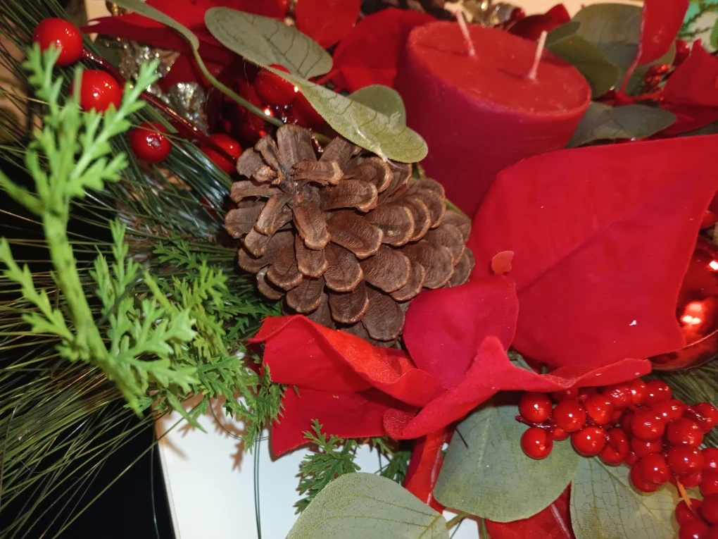 Festive Christmas decoration with red accents, pinecones, and greenery! Perfect for adding a touch of holiday cheer to your home