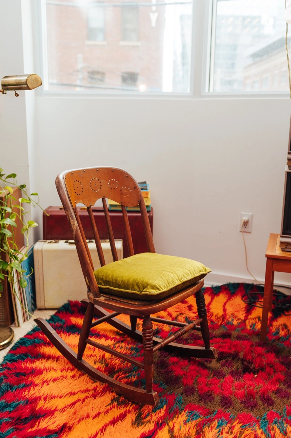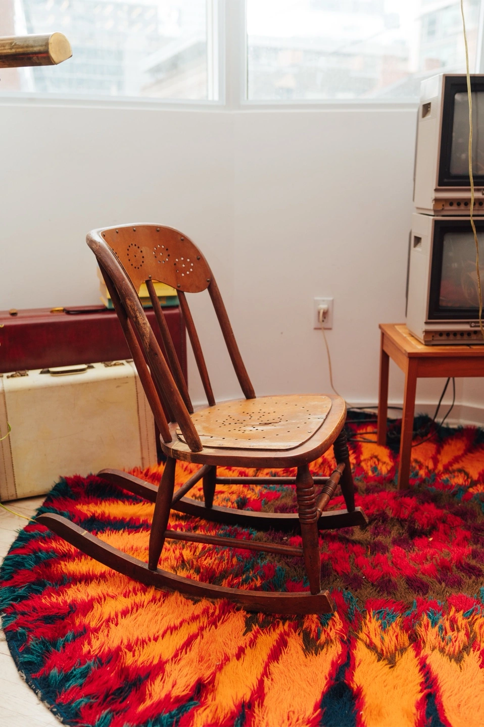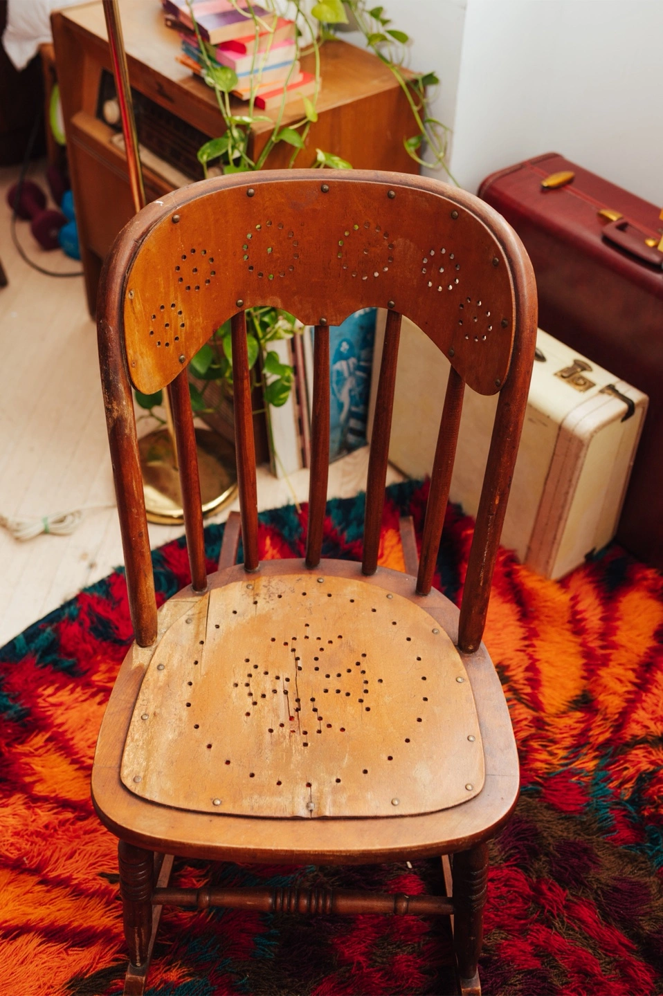 Steam-bent beech frame with riveted joints and curved runners Circular punch-pattern seat and backrest Vintage 1930-’s-1950’s Would be a cozy nursery rocker Pillow not included β€”-No Claim until Etransfer β€”- Pickup at Adelaide St E & Sherbourne, downtown. Delivery Available in the GTA + beyond. DM for rates. You are always welcome to send an Uber Courier. ____________ Follow my Commerce Profile for more Vintage Furniture & Home Decor -or- Follow on Instagram @_sundaycreative S U N D A Y C R E A T I V E ✨✨ { Shop the Entire Vintage Collection on Instagram } View My Other Ads