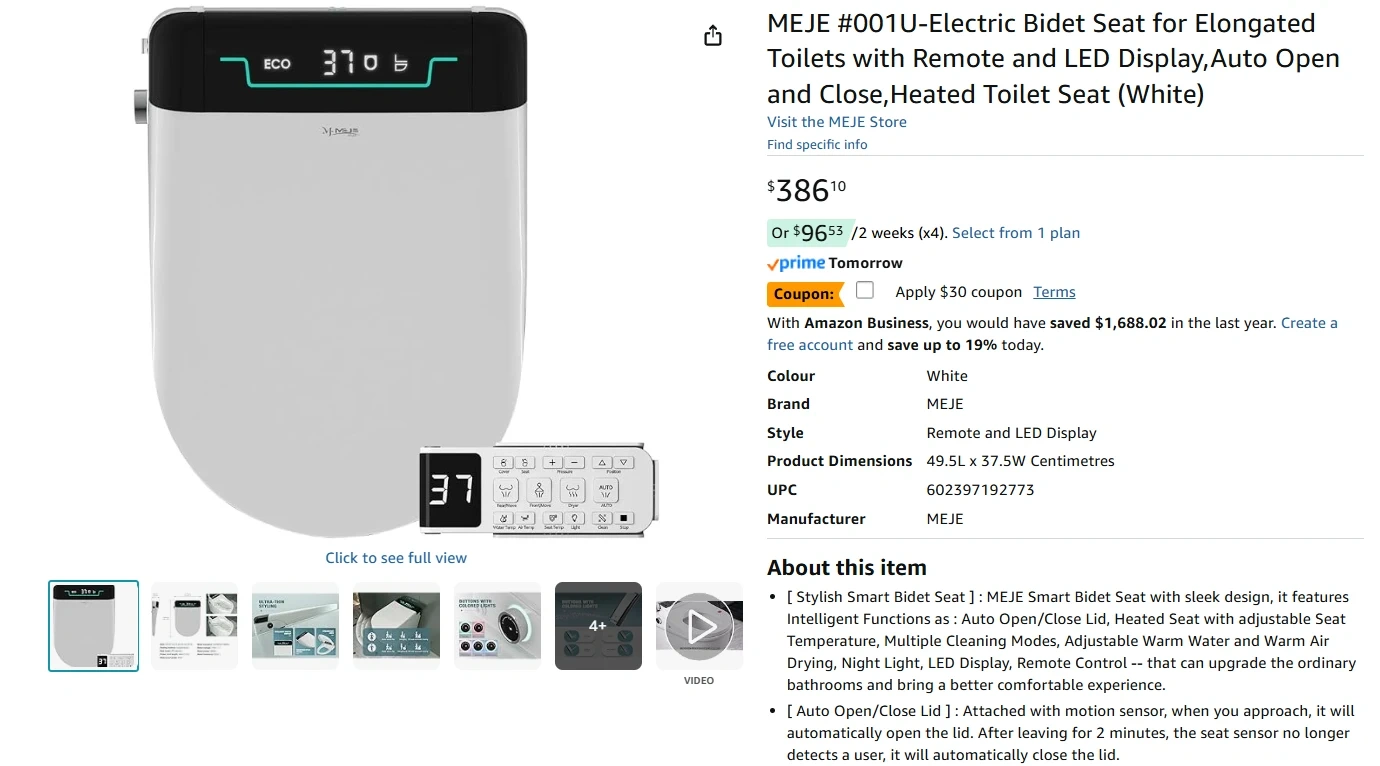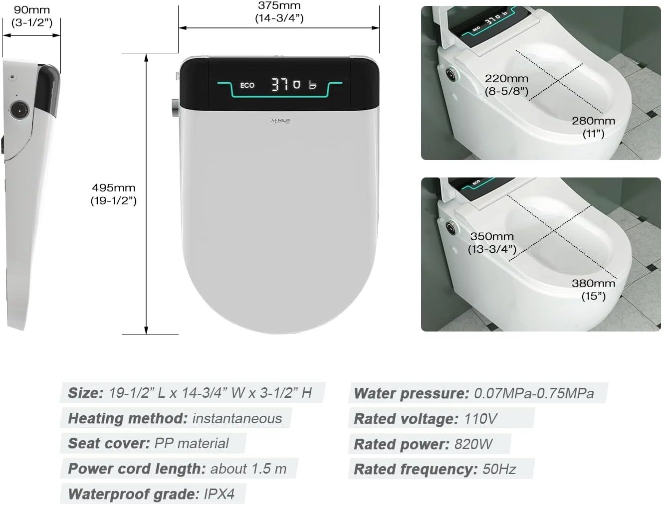 [ Stylish Smart Bidet Seat ] : MEJE Smart Bidet Seat with sleek design, it features Intelligent Functions as : Auto Open/Close Lid, Heated Seat with adjustable Seat Temperature, Multiple Cleaning Modes, Adjustable Warm Water and Warm Air Drying, Night Light, LED Display, Remote Control -- that can upgrade the ordinary bathrooms and bring a better comfortable experience.