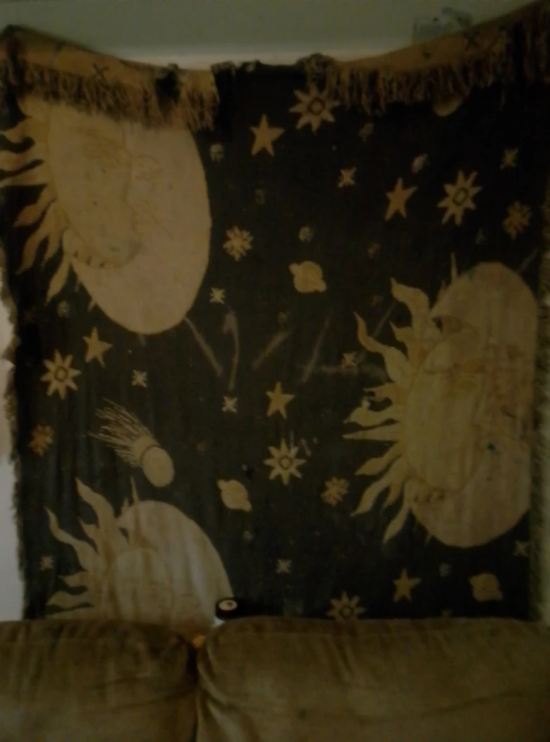 This wall tapestry features a celestial design with suns, stars, and other cosmic elements! It would be a great addition to any room.