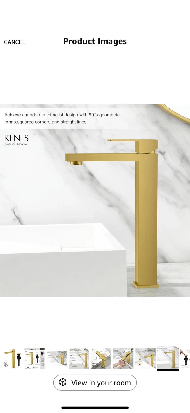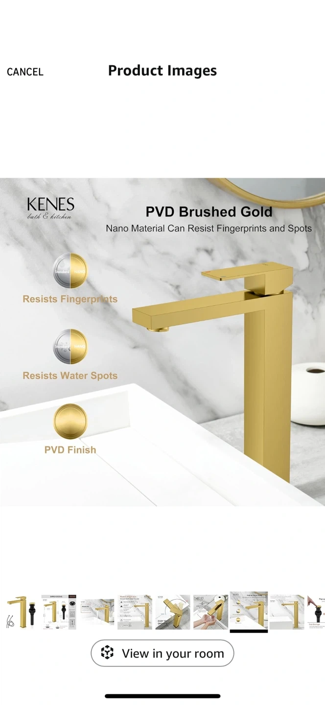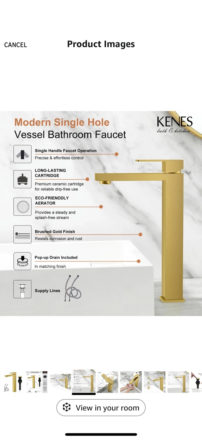 Selling a KENES bath & kitchen modern single hole vessel bathroom faucet. It has a brushed gold finish that resists corrosion and rust.