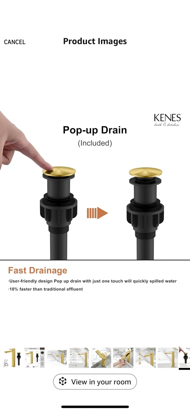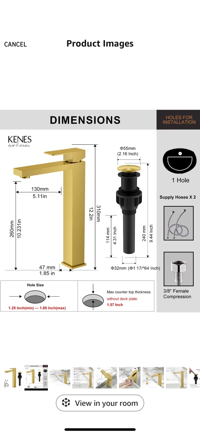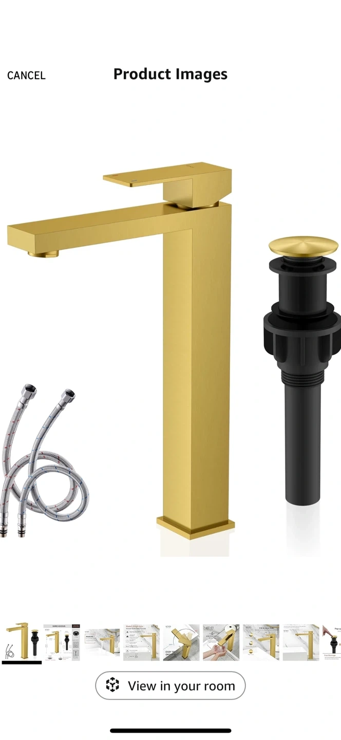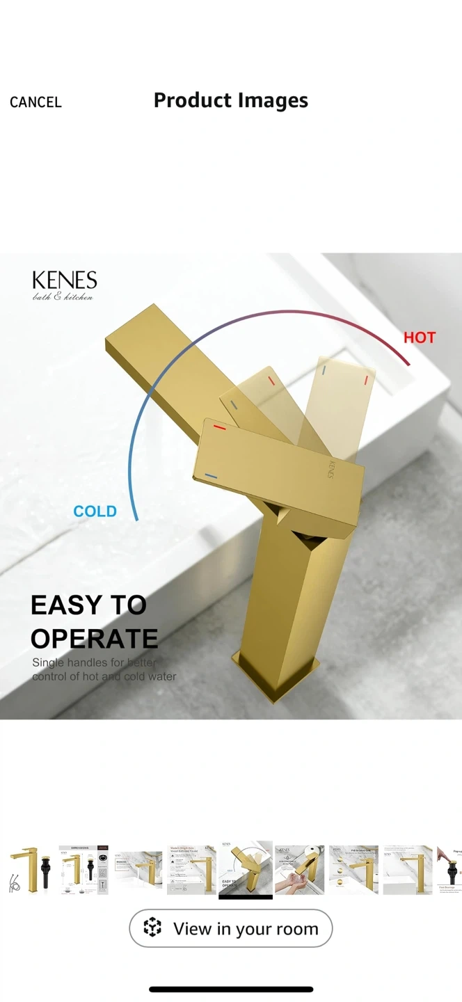 Selling a KENES bath & kitchen modern single hole vessel bathroom faucet. It has a brushed gold finish that resists corrosion and rust.
