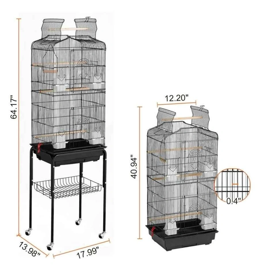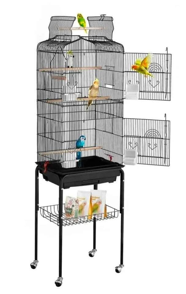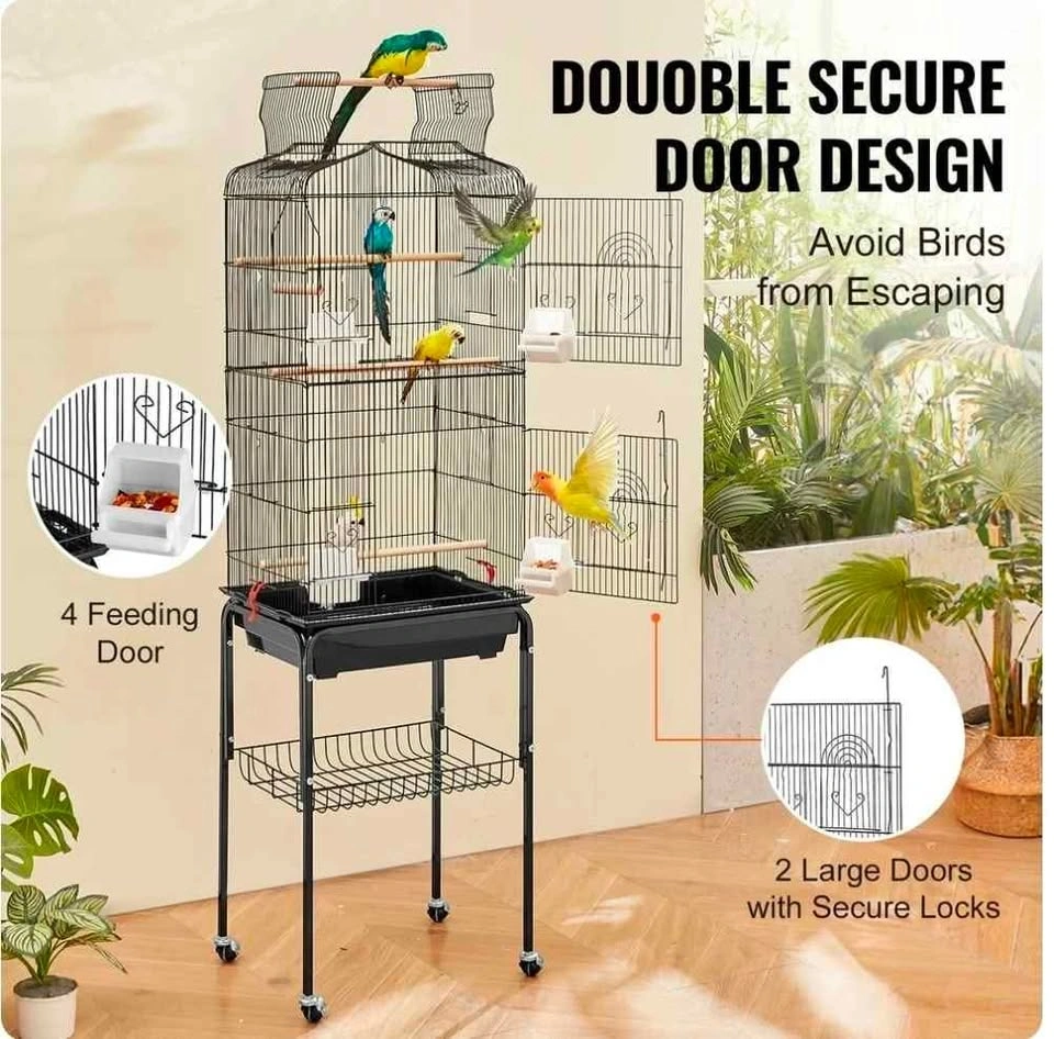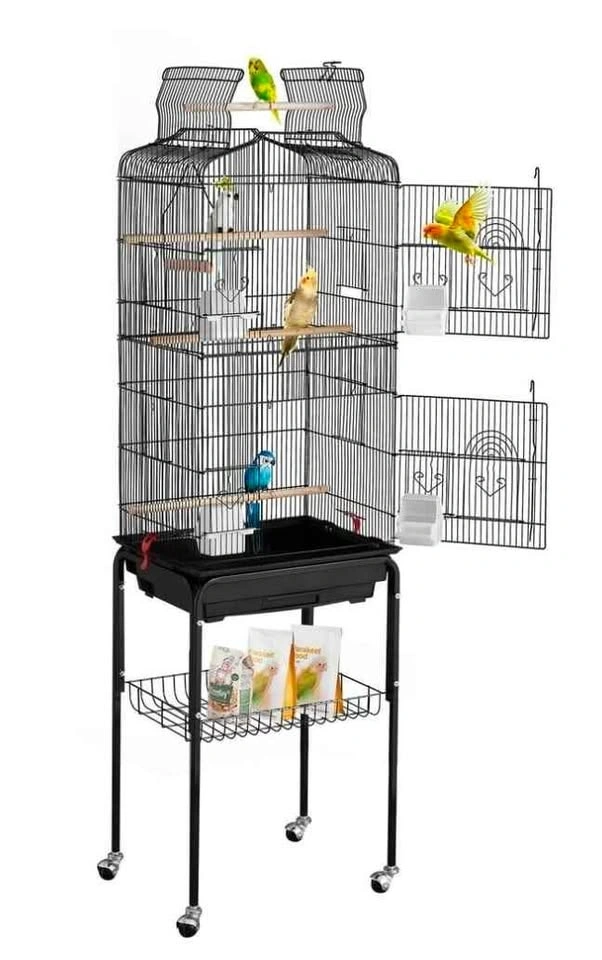 This birdcage provides a spacious and comfortable living space for small to medium-sized birds. The top can be opened to allow birds to enjoy free flying, and the double door design makes interaction easy. The bottom stand comes with a storage shelf and wheels, making it easy to move and store.