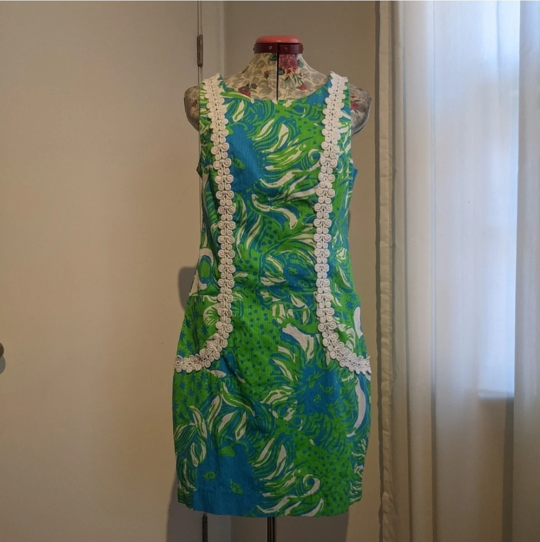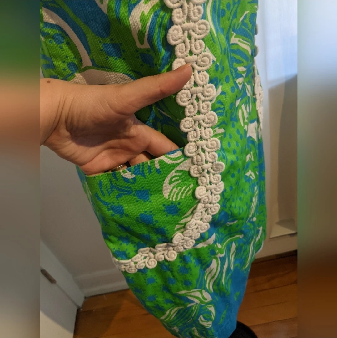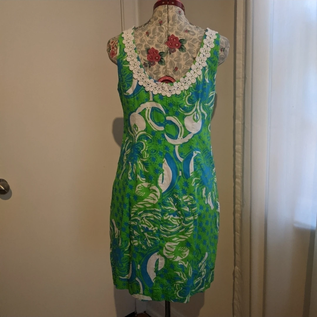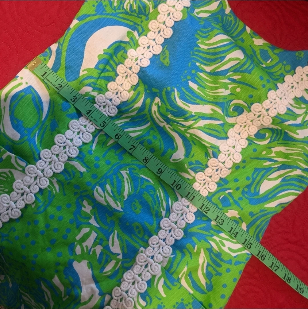 This is a cute Lilly Pulitzer sleeveless dress with a blue and green pattern. It has white lace trim along the sides. Perfect for summer!