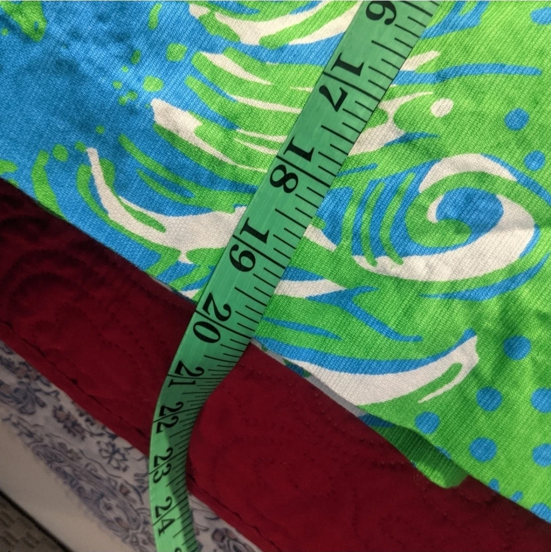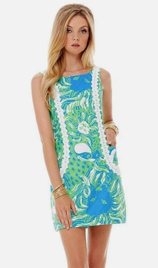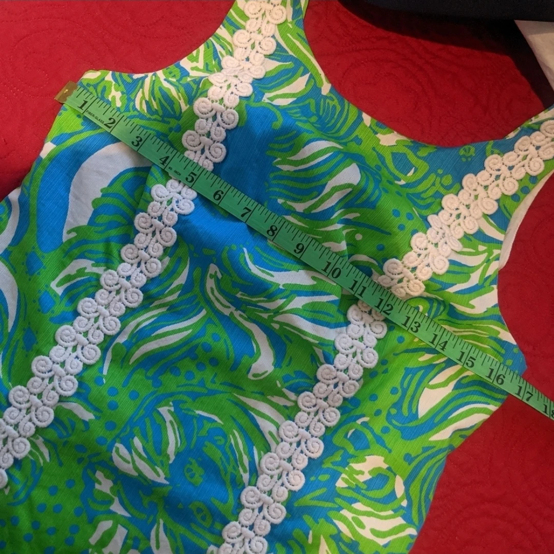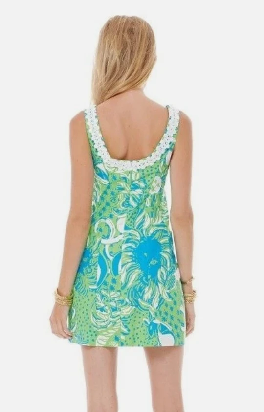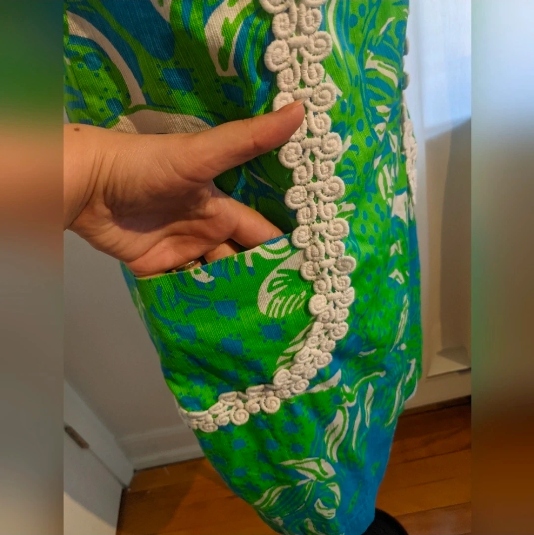 This is a cute Lilly Pulitzer sleeveless dress with a blue and green pattern. It has white lace trim along the sides. Perfect for summer!