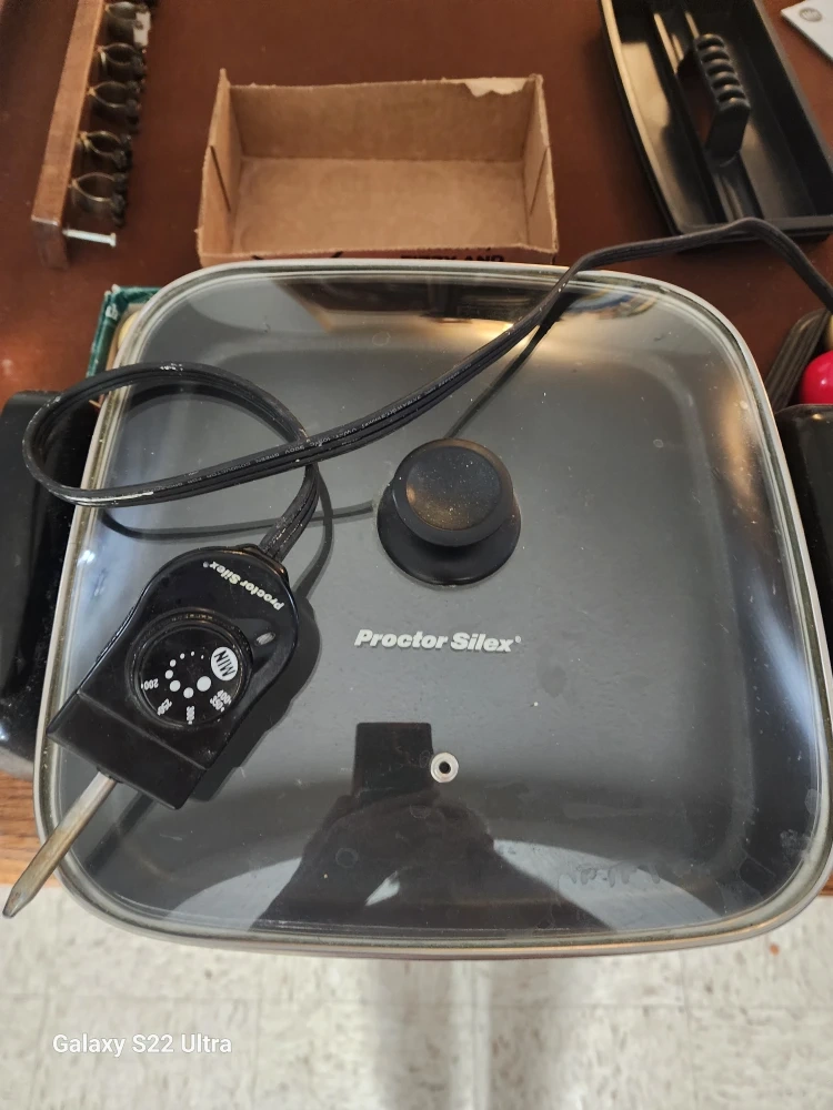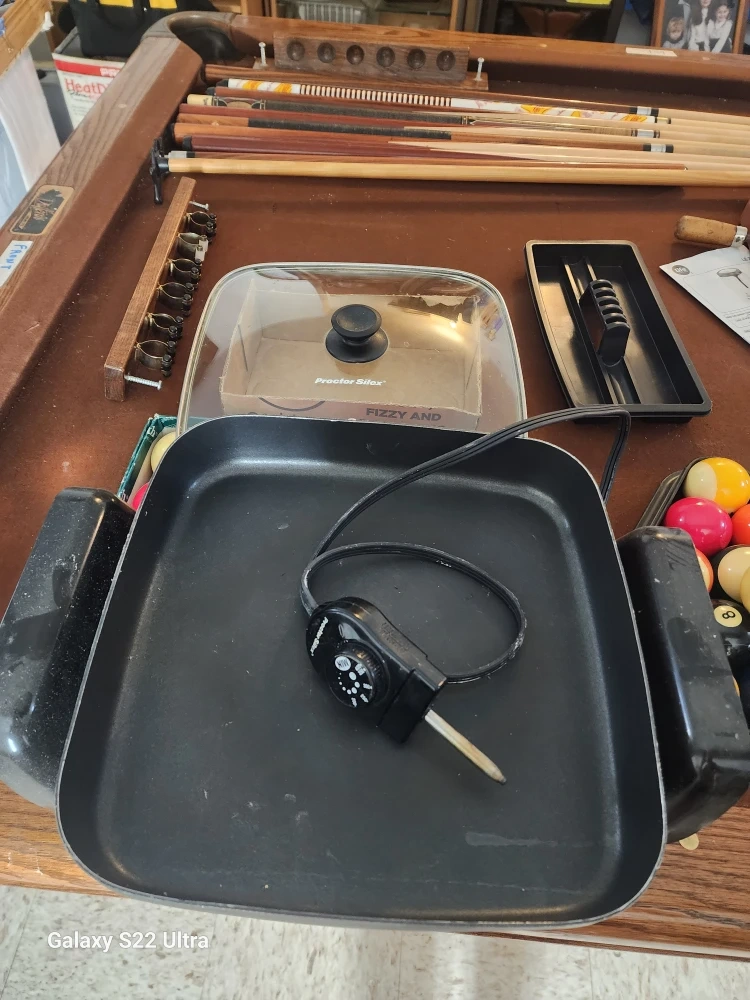 EASY FAST USE AND CLEAN. Selling a Proctor Silex electric skillet with a lid and temperature control and a George Foreman Lean Mean Fat Grilling Machine. Both good condition, used twice ready for your next meal! Cook 4 to 6 hamgurgers at once OR MIX EGG, MEAT AND VEG ALL AT ONCE.