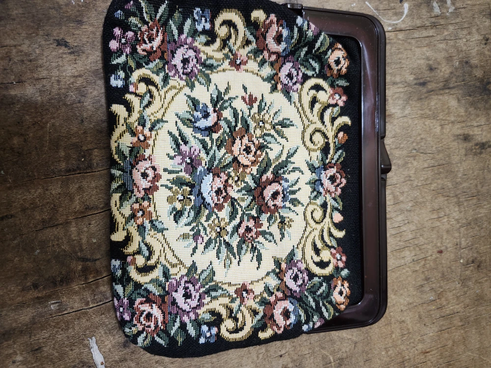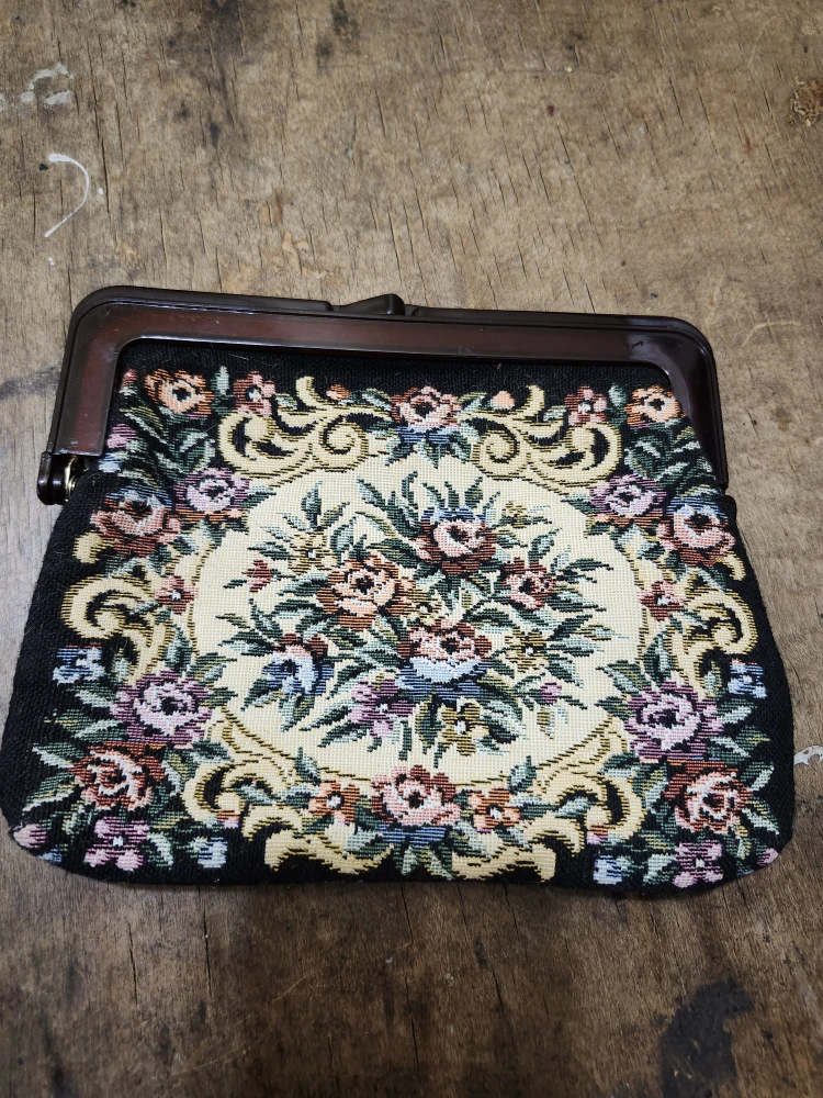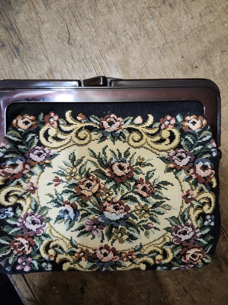 This is a beautiful floral tapestry kiss lock clutch purse. It features a lovely floral design on a black background. It's perfect for adding a touch of vintage charm to any outfit