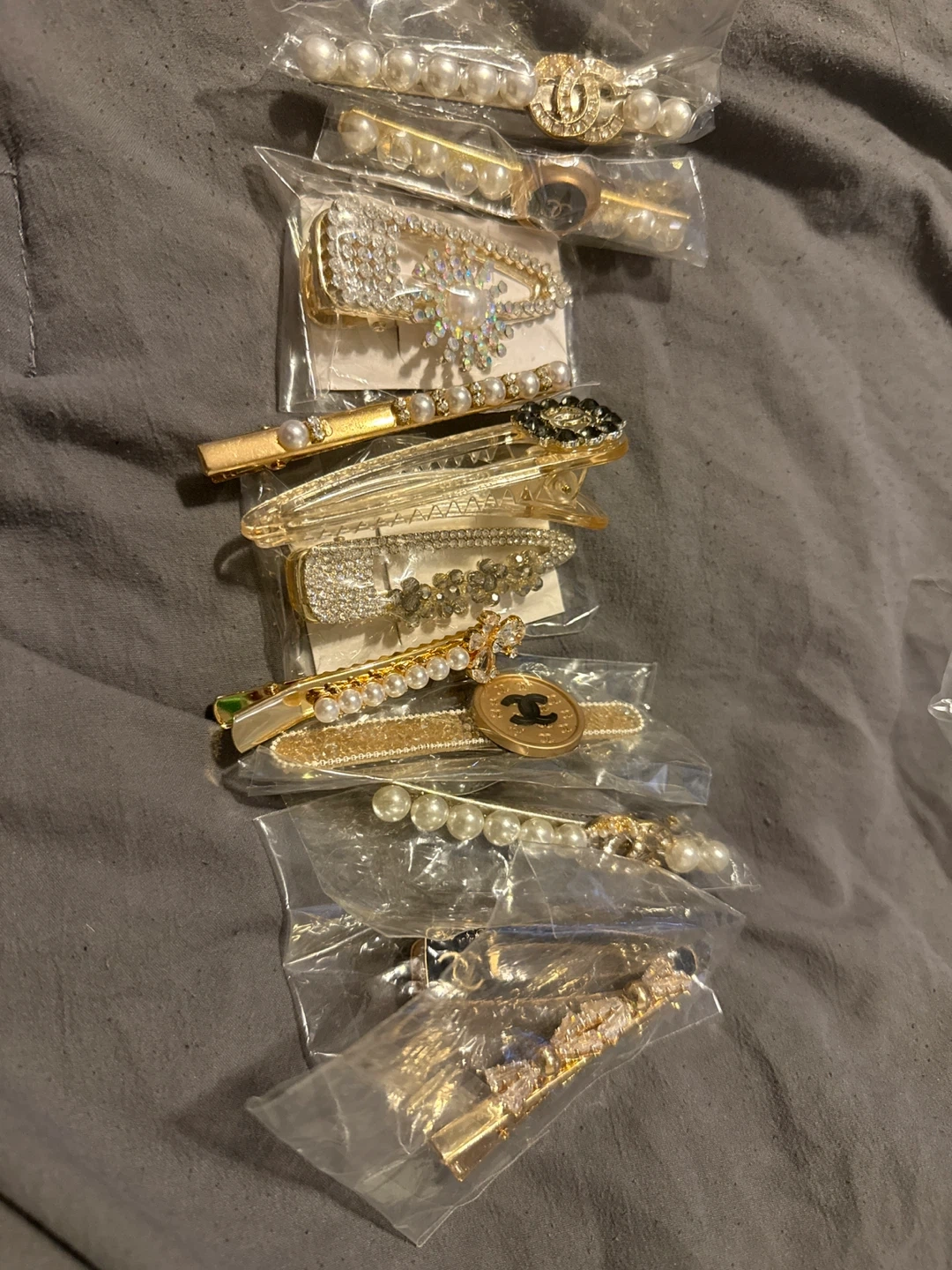 I have a collection of assorted hair clips for sale. They are mostly gold in colour and feature pearl and rhinestone accents. Perfect for adding a touch of sparkle to your hair! Perfect to use as gifts! $5 each, 2 for $9, 3 for $11, 4 for $13, 5 for $15, 6 for $17