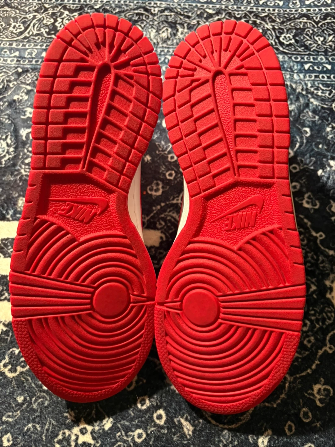 Selling a pair of Nike Dunk High Retro sneakers in red and white. They are in great condition and ready for a new home! Size is 6.5Y.