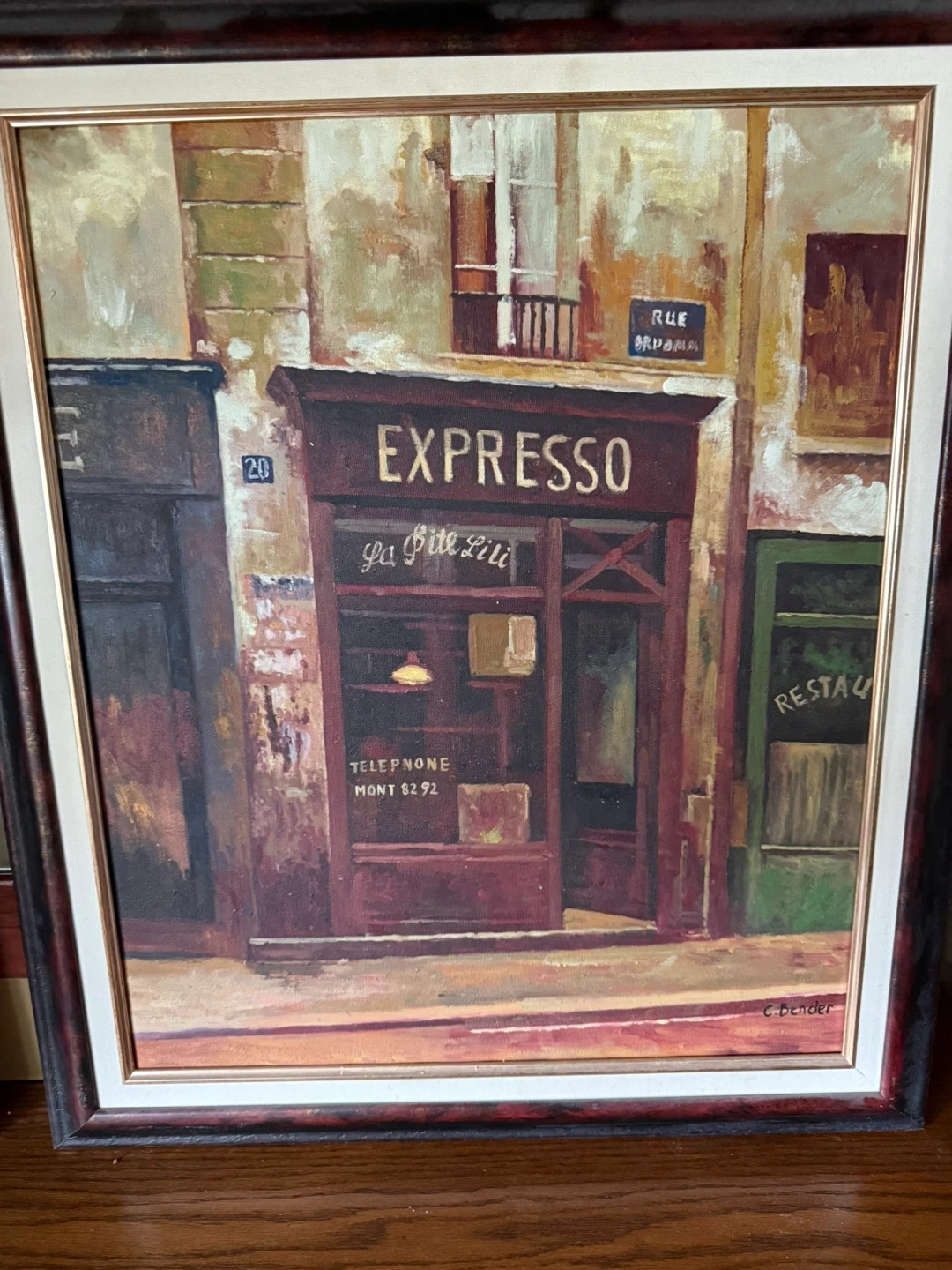 Here's a charming vintage painting of an "Expresso" shop, signed by C. Bender. It's framed and ready to hang, adding a touch of Parisian cafe culture to your home. The painting features warm, inviting colours and a detailed depiction of a classic European storefront