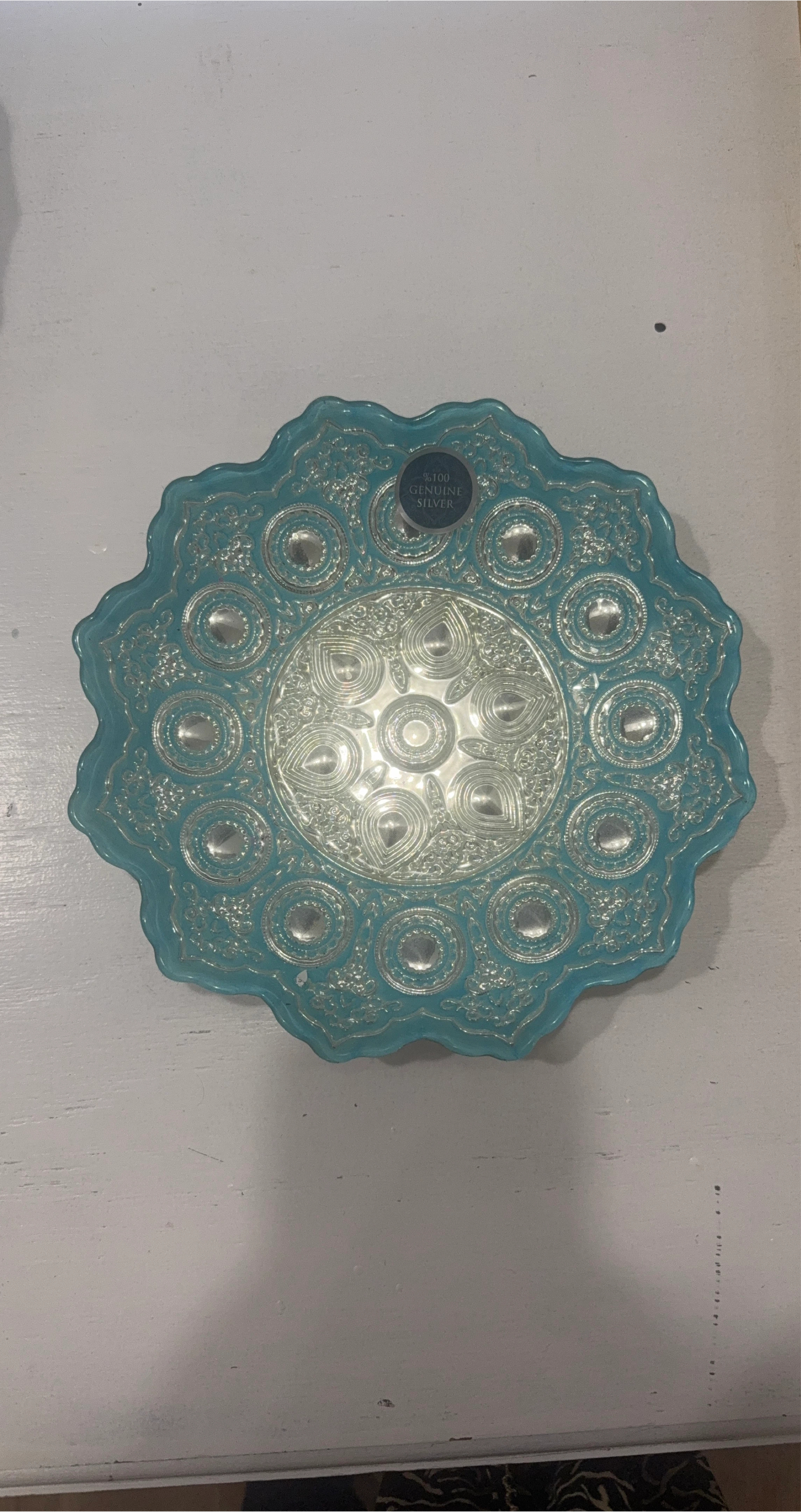Selling a decorative plate featuring genuine silver accents! It has a beautiful, intricate design and a lovely light blue color. Perfect for adding a touch of elegance to your home decor