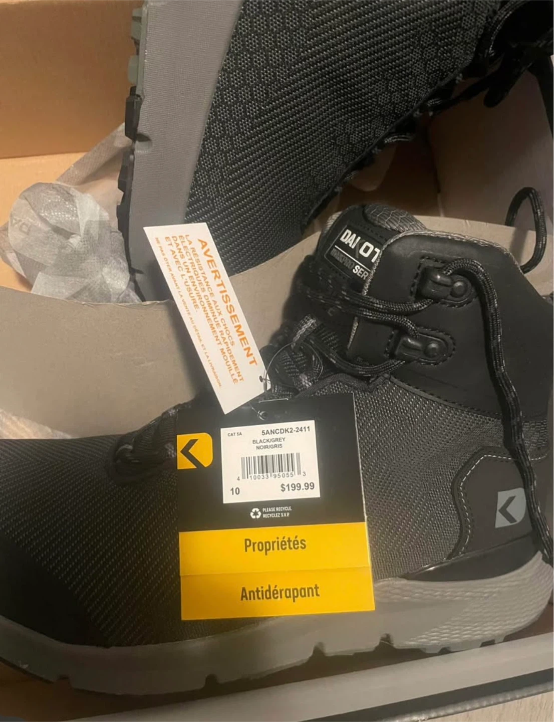 These Kodiak waterproof boots are brand new in the box! They are black and grey, size 10. These are anti-slip and originally bought for $199.99+ tax. Brand New safety shoe