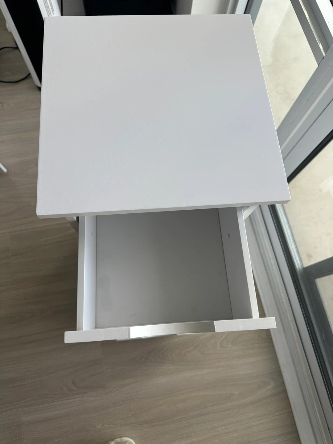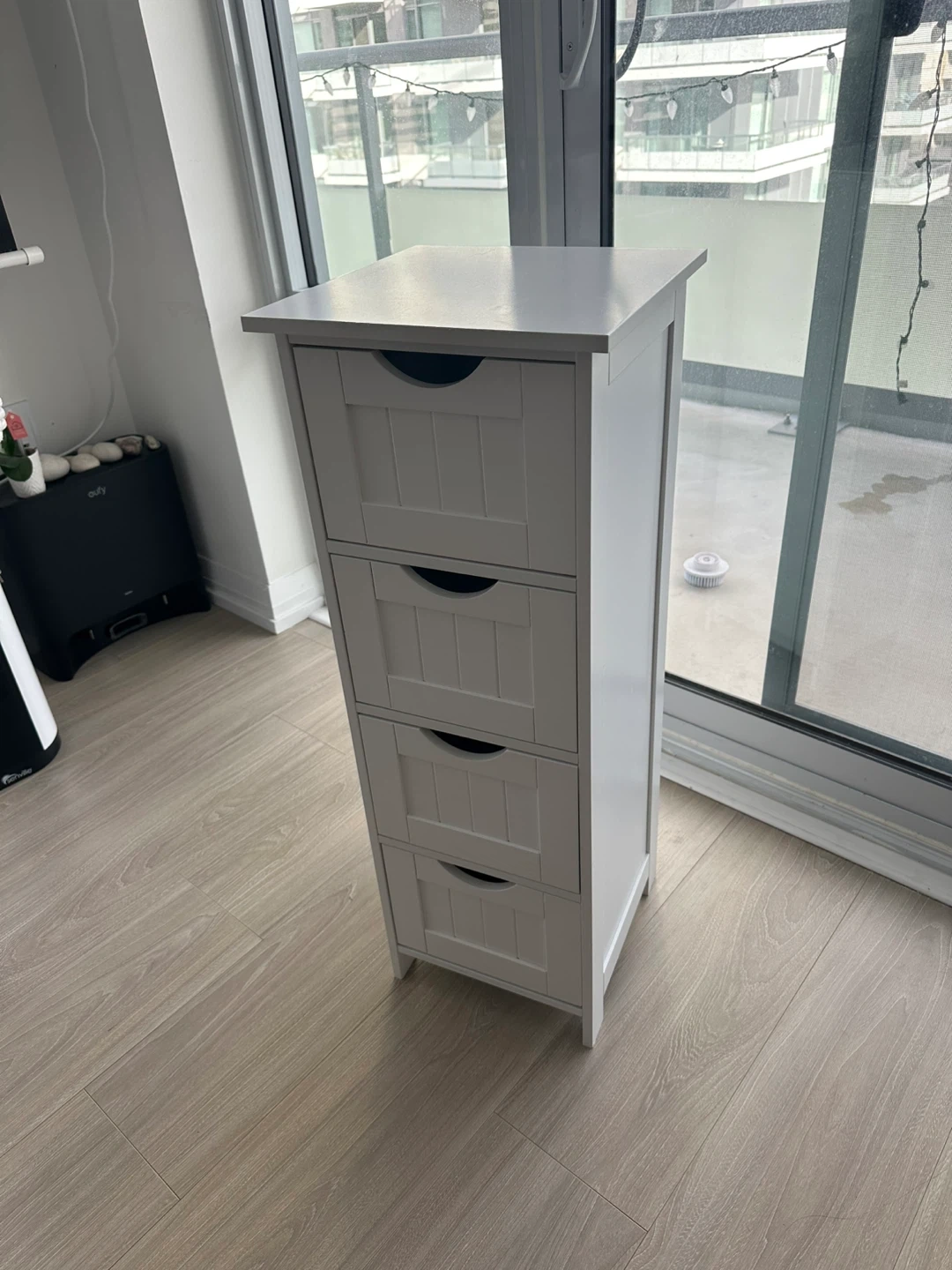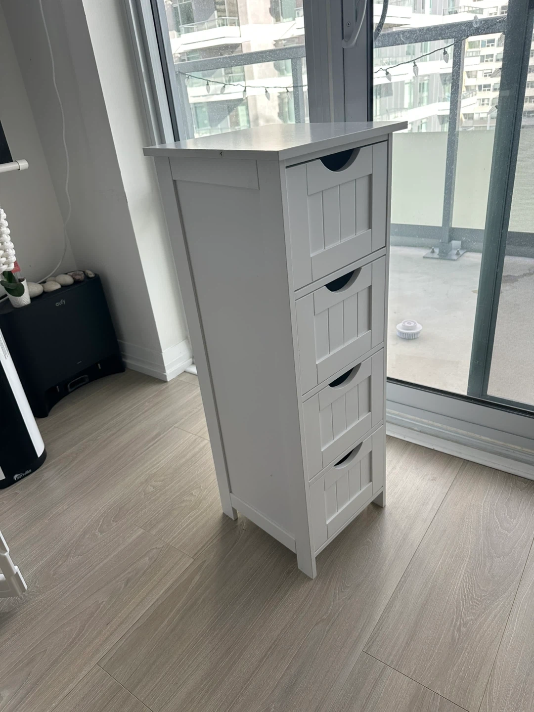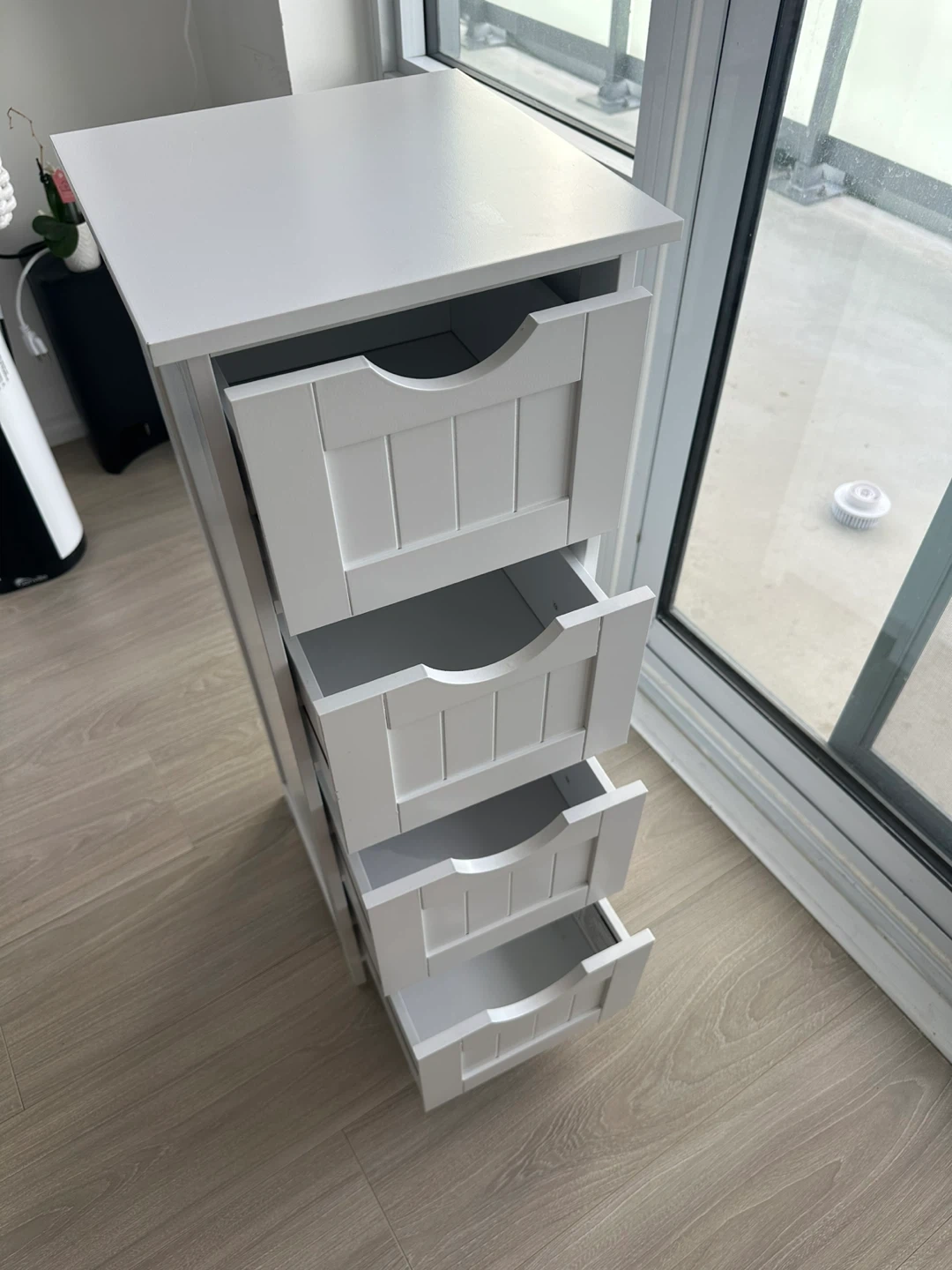 New like freestanding white storage cabinetwith four drawers! It's perfect for adding some extra storage to a bathroom, bedroom, or any other space where you need a little more organization.
